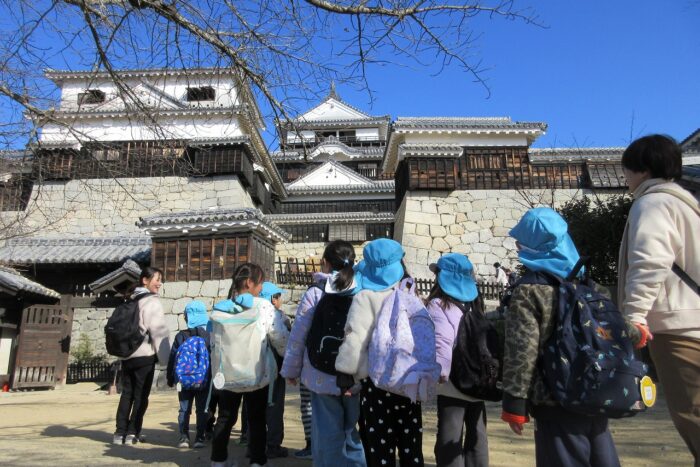 らいおん組になってから、ずっと楽しみにしていた「ハッピーデー」の日がついにやってきました!ワクワクした様子で登園してくる子どもたち。松山城に登る坂道では、元気いっぱい駆け上がり予定時間よりも早く到着。ゆっくり景色を眺め「保育園はあそこかな」「僕の家はあっちかな」と友達と指をさしながら探していました。その後で、蛇口から出るみかんジュースを飲みに行きました。蛇口を前にし、どう使うか分からず戸惑う子ども……