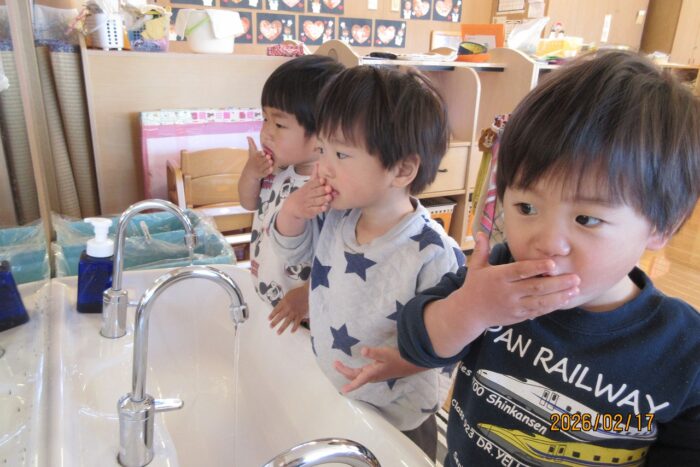 節分の日が近づいてくると、「鬼はー外」「福はー内」と元気いっぱいに叫んで豆まきをする子どもたちの姿が見られ、鬼をやっつける準備をしてきました。怖がらずに心の鬼をやっつけることができるのかな?前日には、らいおん組が炒り豆を作ってくれました。「なんかいい匂いがする」「美味しそう食べてもいい?」と嬉しそうな声も聞こえてきました。 とうとう節分の日がやってきました。集会では、「節分の鬼」と……