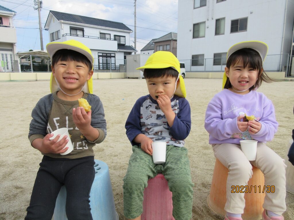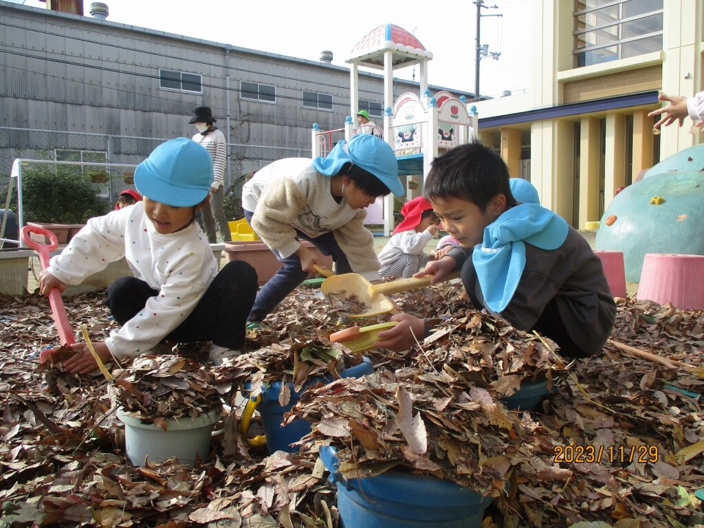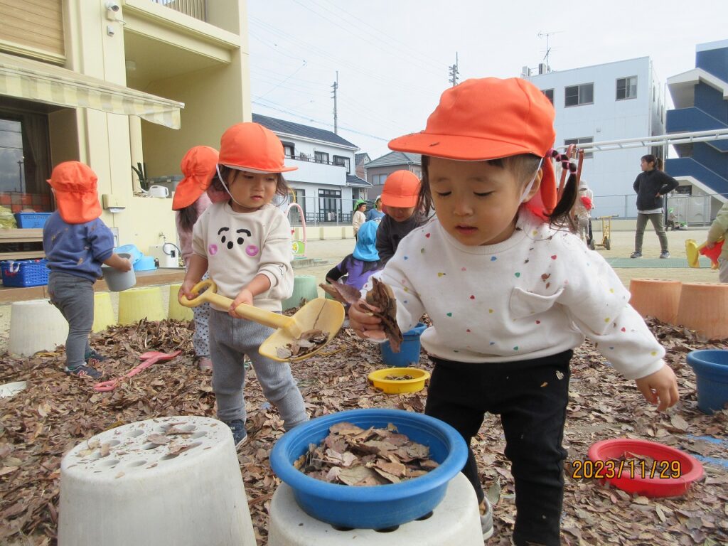 七五三詣りに日吉神社に行った時やお散歩の時、落ち葉をいっぱい集めてきました。焼き芋をする前に落ち葉遊び。園庭に落ち葉を敷き詰め、寝転がったり、踏みしめたりして遊びました。「フカフカしてるね」「いろいろな色の葉っぱがある!」と大喜び。風が吹いて葉っぱが舞ったり、素敵な秋の光景が見られました。