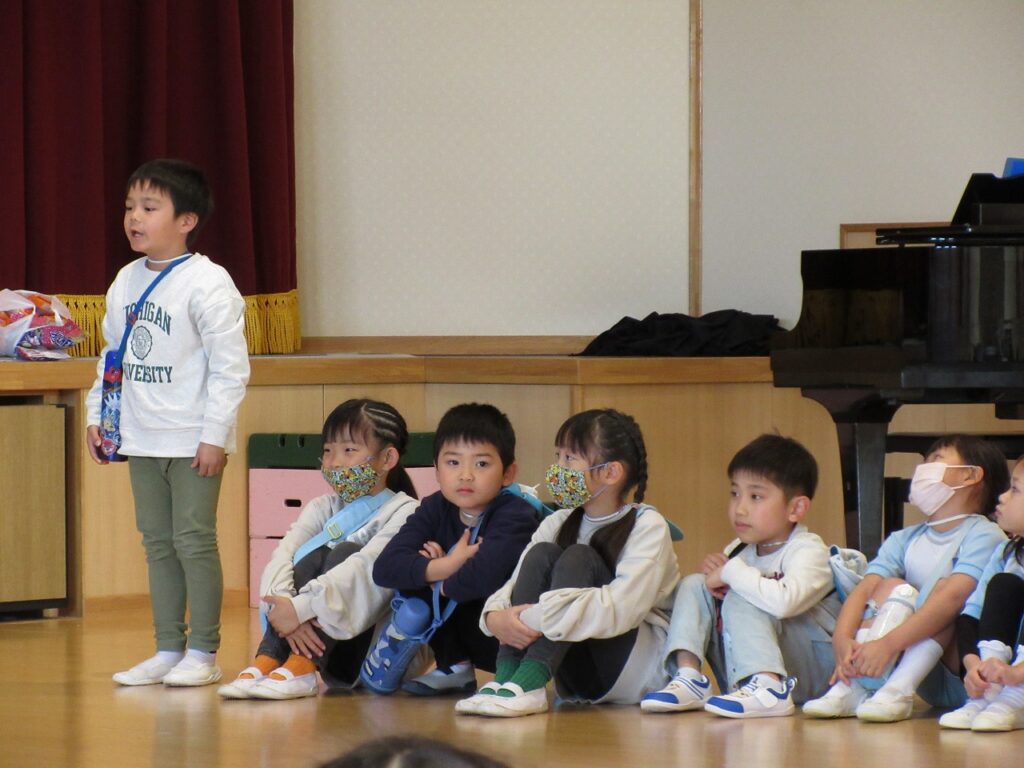 初めての場所、知らない先生や友達に始めは緊張した様子も見られましたが、気付けば隣の子と話していたり、手をつないで移動したりする姿が見られました。大人が言わなくても自然と関わることができるコミュニケーション力が育っていることを感じました。きっと小学校に行ったときに「あ、校区別の集いで会った友達だ」とすぐに仲良くなることができることでしょう。今日の姿を見て自信を持って送り出すことができます。4月から楽しく小学校生活を送ってくれることを願っています。