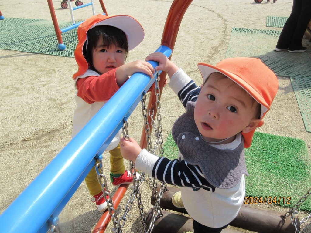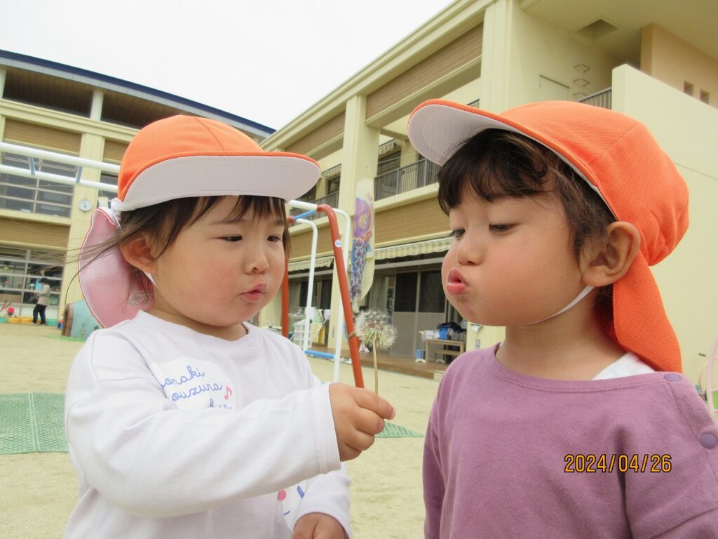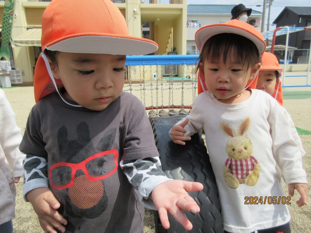 園庭では友達と一緒に虫や草花を見つけたり触れたりして喜んでいます☺