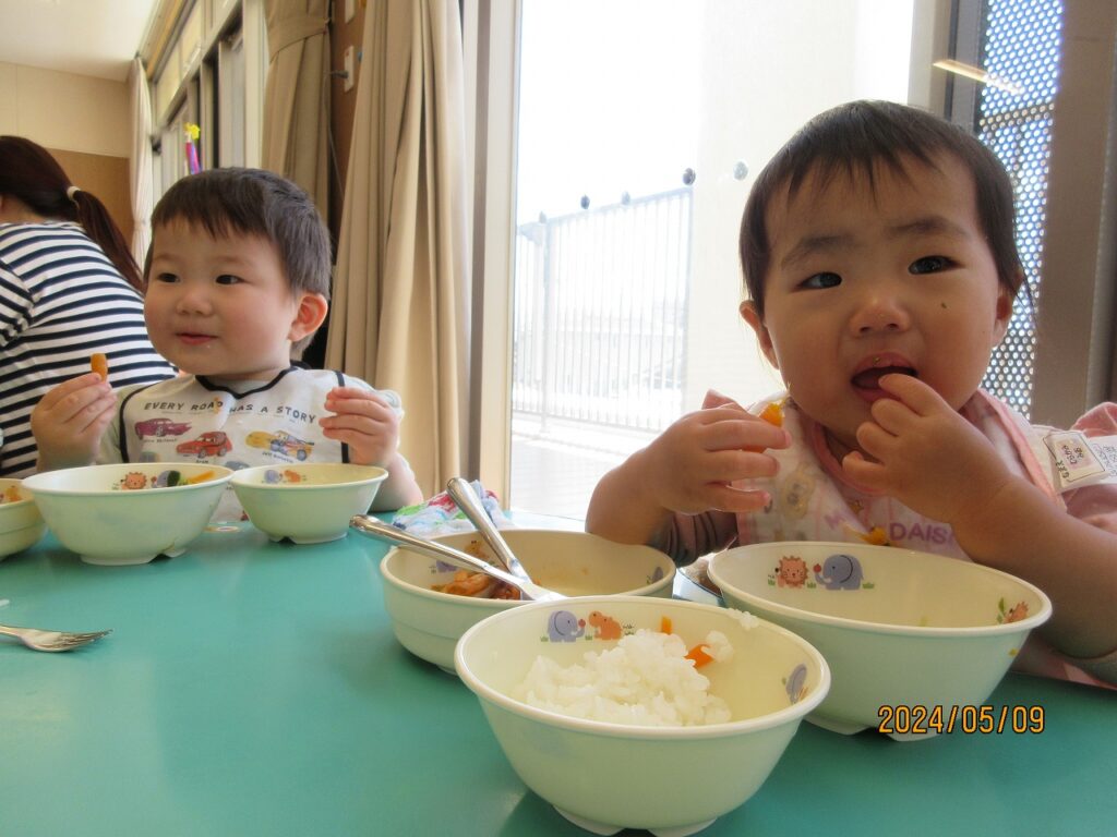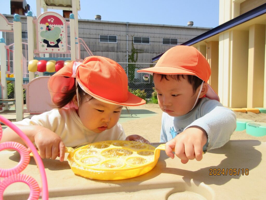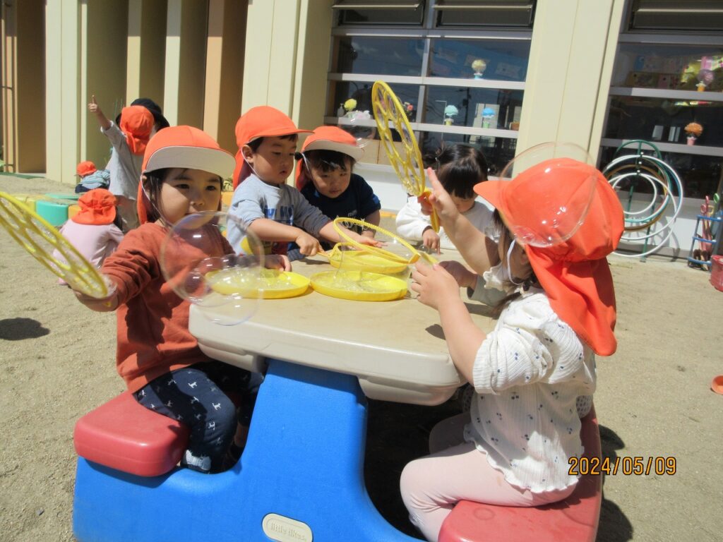 最初は上手く膨らまなかったしゃぼん玉も、お兄ちゃんやお姉ちゃんが遊んでいる様子を見てまねっこしているうちに自分で作れるようになりました☆