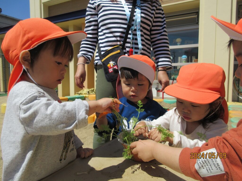 園長先生がプランターで間引きしている様子が気になり、見に行くと間引いたにんじんをもらいました!そこで、にんじん洗いに挑戦することに・・・🥕