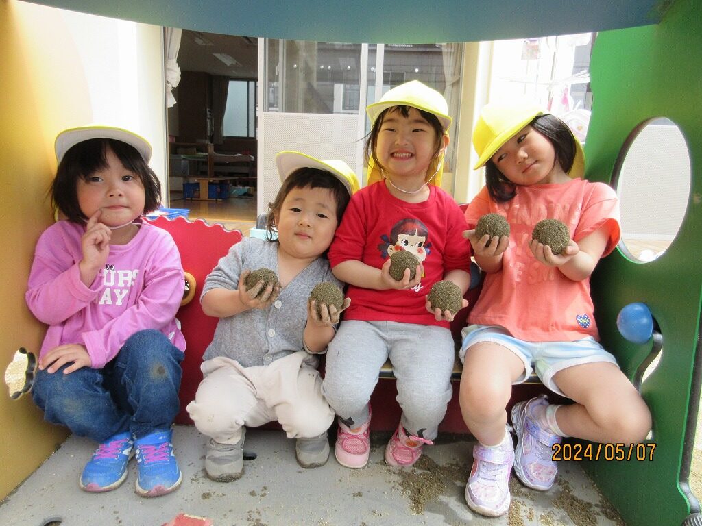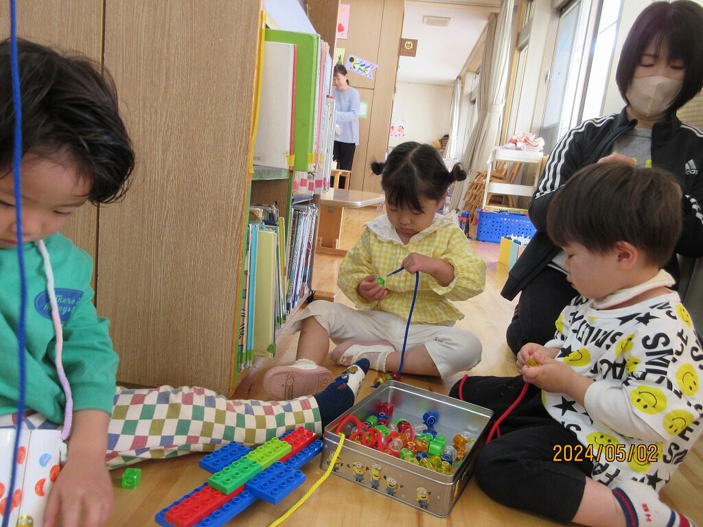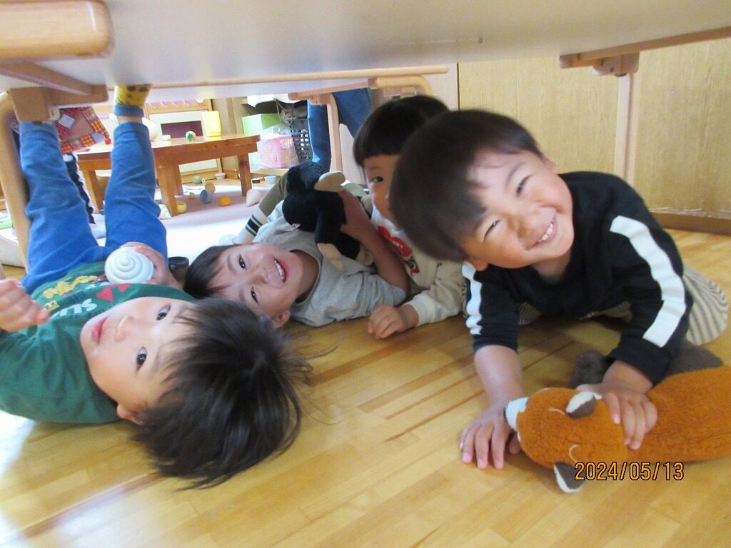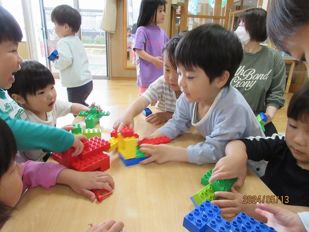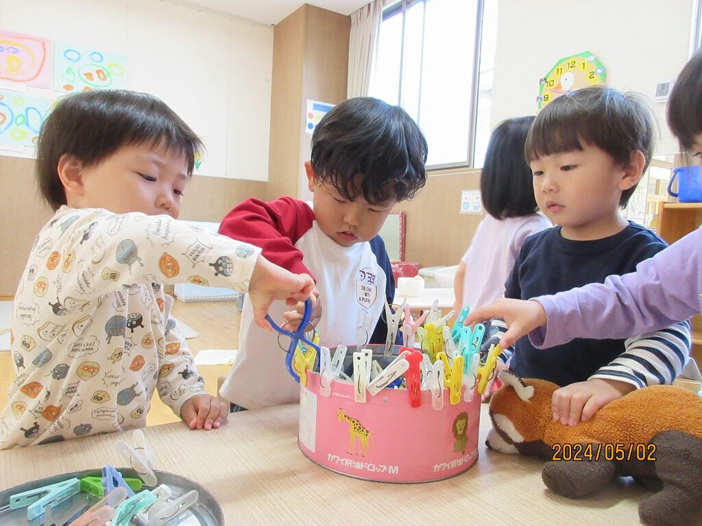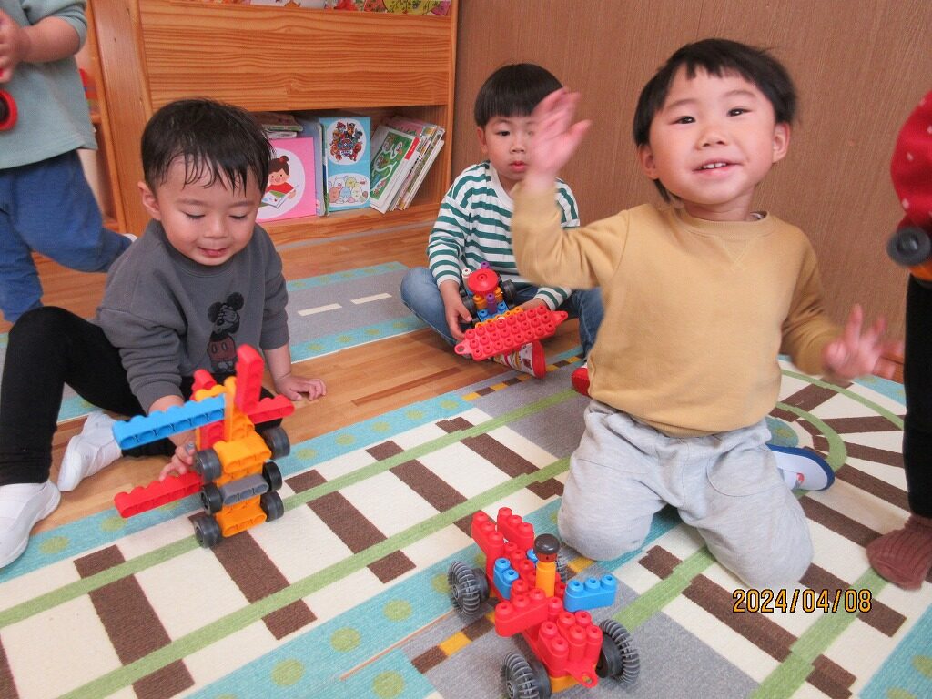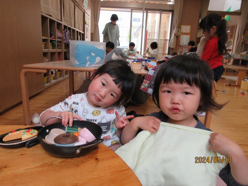 あひる組さんは、新しい友達が3名入ってきました。友達や保育士の名前も覚えて、楽しく遊んでいます。一人で遊ぶ姿から友達と同じ遊びをするのが楽しいという姿に変わってきています。その中で、「ぼく~~!」「わたしの~!」とトラブルも多いですが、保育士が仲立ちしながら、関わり方を知らせているところです。いろいろな経験を重ねて成長してほしいと思います。
