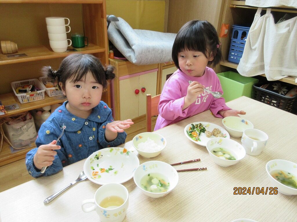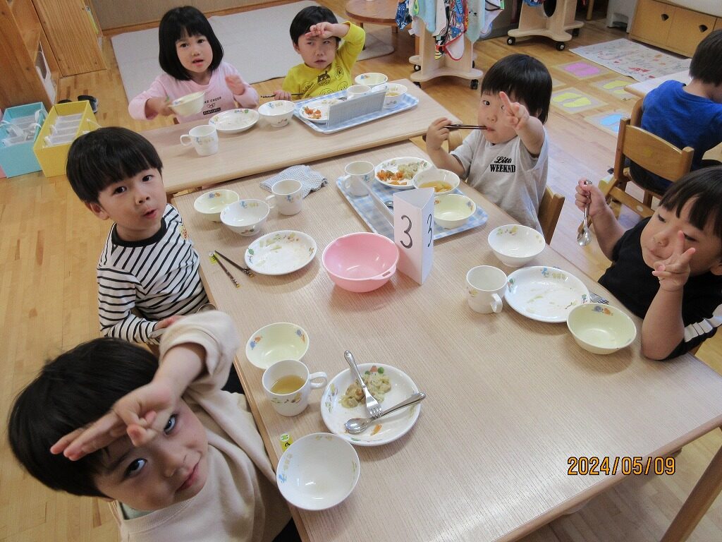 食事では、苦手な物もみんなで食べると食べてみようとする気持ちがあるようです。おかわりもいっぱいしてモリモリ食べてくれますが、なかなか正しい姿勢で食事をするのが難しいようです。只今、スプーンやフォークの3指持ち(しっかり持てるようになってからお箸に移行していきます。)や正しい姿勢で食べることに気を付けています。