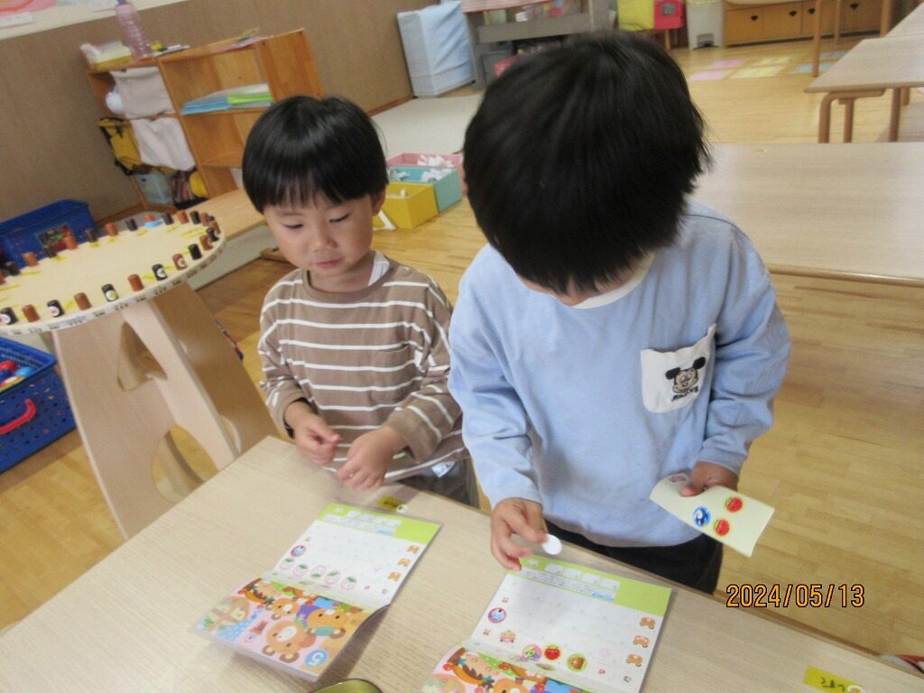 <朝の支度>・・・出席ノートにシールを貼ったり、タオルや歯ブラシコップを自分のマークに吊るしたり、ひとつひとつ確かめながら支度をしています。「先生!どこにシール貼るの?!」「ここであってる?」「昨日ね~」などたくさんのやりとりがあります。