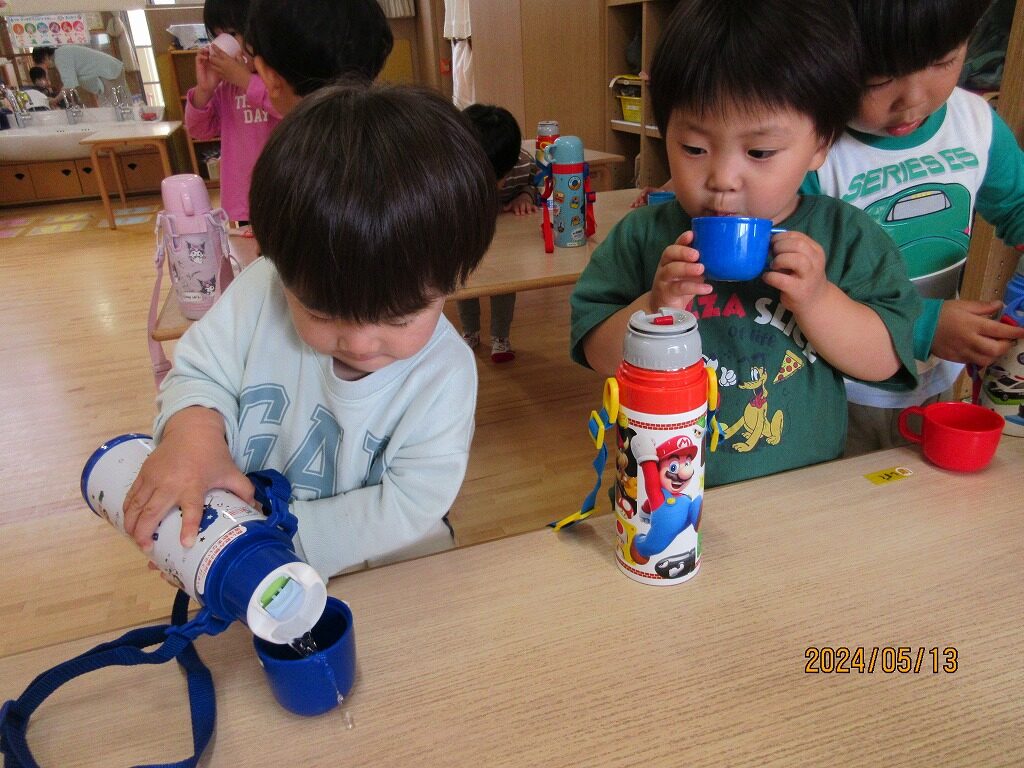 食後の歯ブラシ、口ゆすぎ(2歳児)をしたり、水筒のお茶を上手に注いだりしています。手のコントロールがなかなか難しいですが、こぼさずにコップに注いでいます。