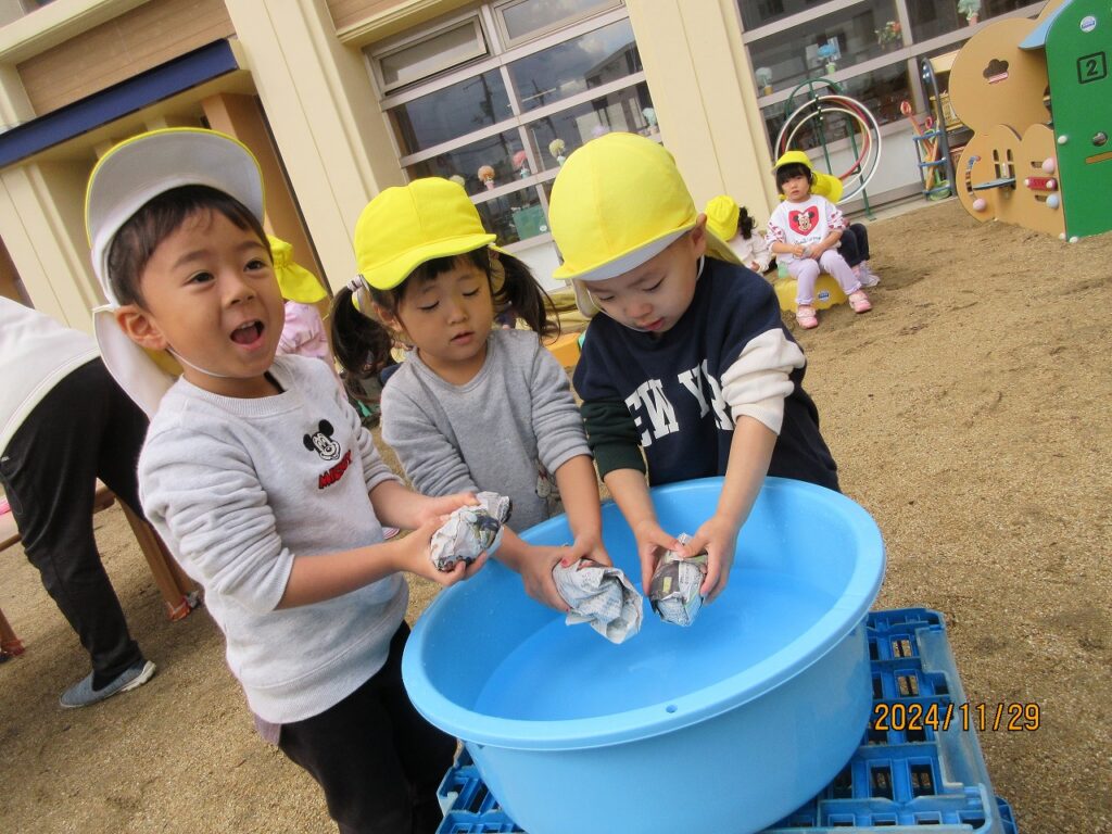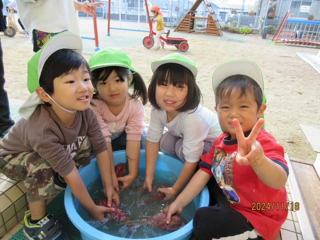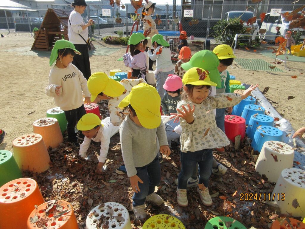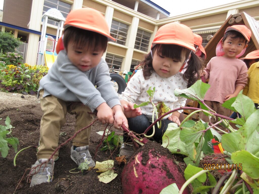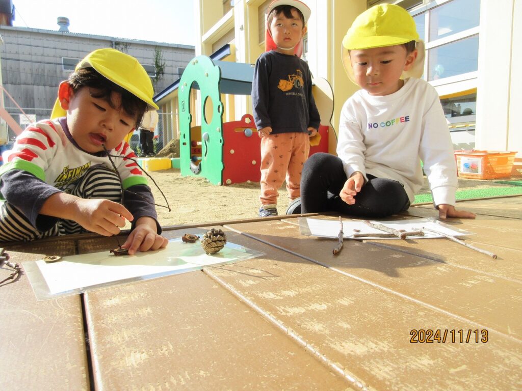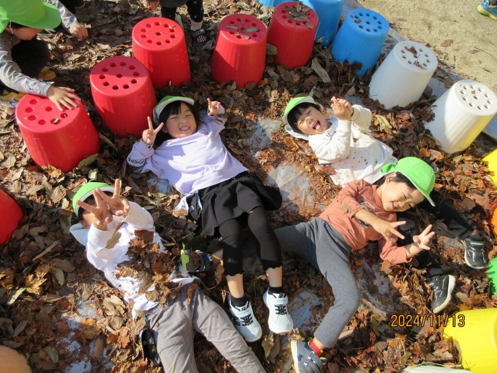 やきいもを楽しみに集めた落ち葉や小枝、木の実を使って、まずは秋あそびを楽しみます♪落ち葉のプールで落ち葉を降らせ大盛り上がり‼ふかふかの落ち葉にごろり~ん☆『気持ちがいいね❤』秋のお絵描きもしました。松ぼっくりや小枝、葉っぱを使って、バッタや鳥などができました♫素敵なアート作品です♡園庭でとれたさつまいももとっても大きく育っていました!みんなで掘ったさつまいもを自分たちで洗って、泥をのけます。『早く食べたいね』『楽しみだね』とどんどん期待が膨らみます♬