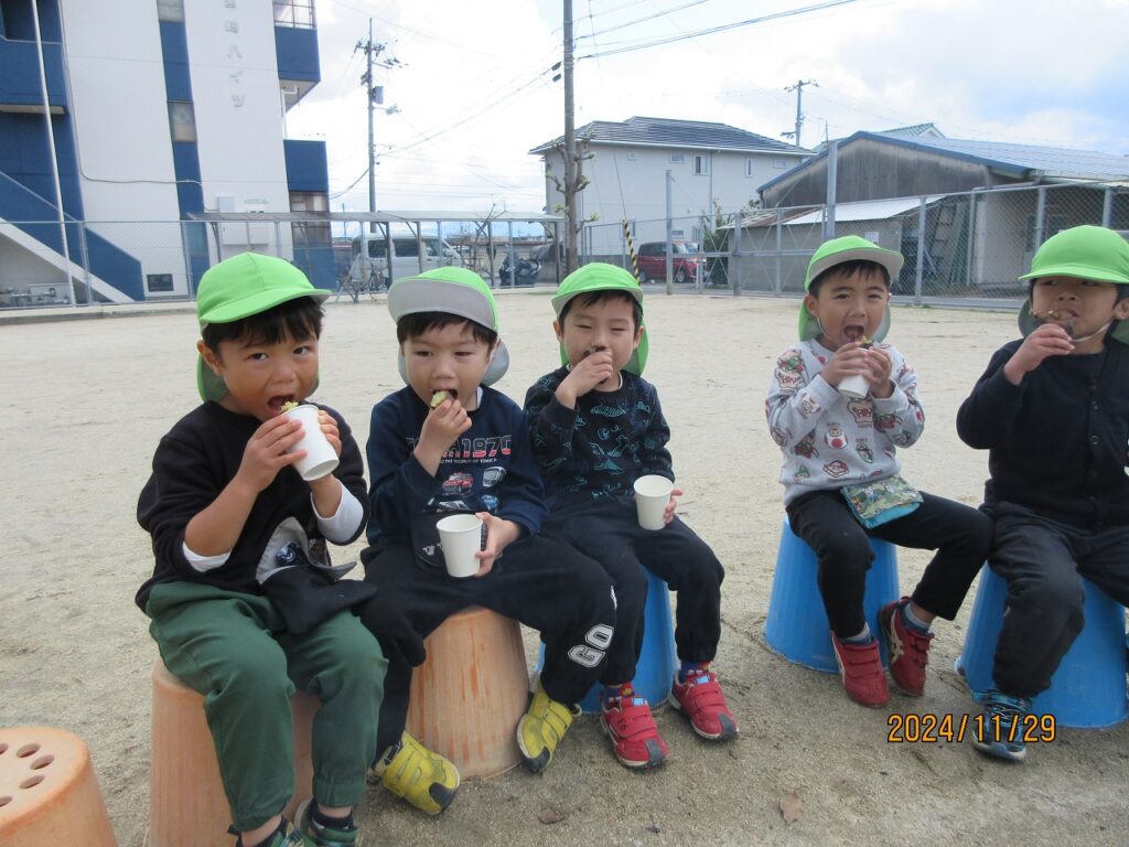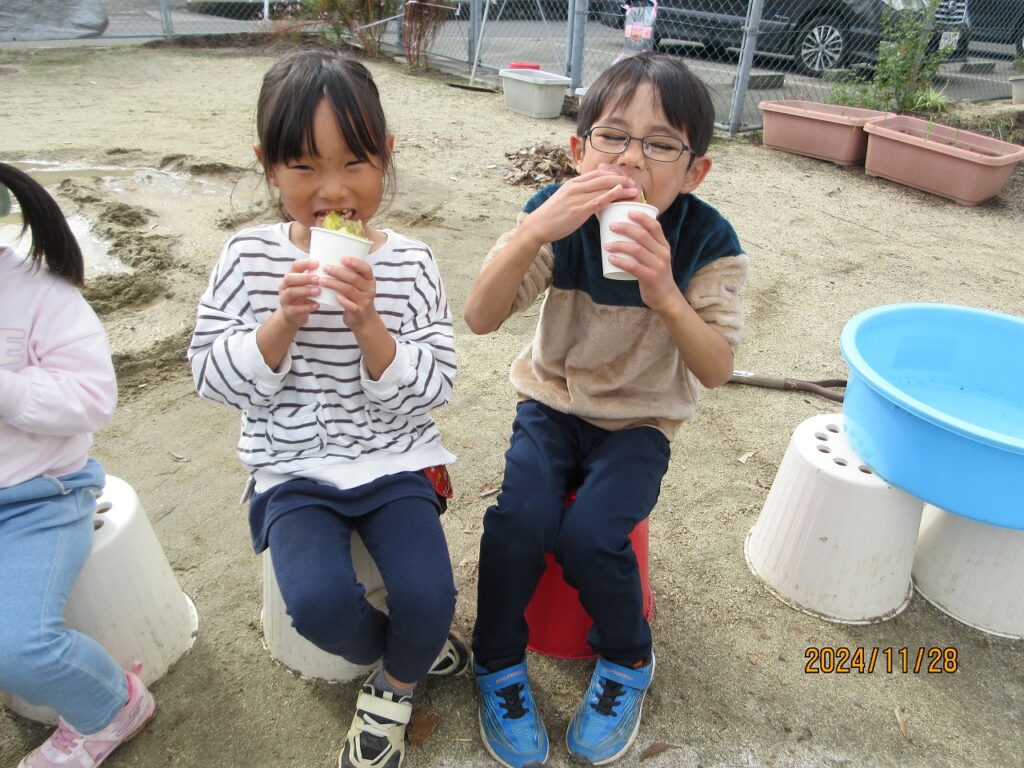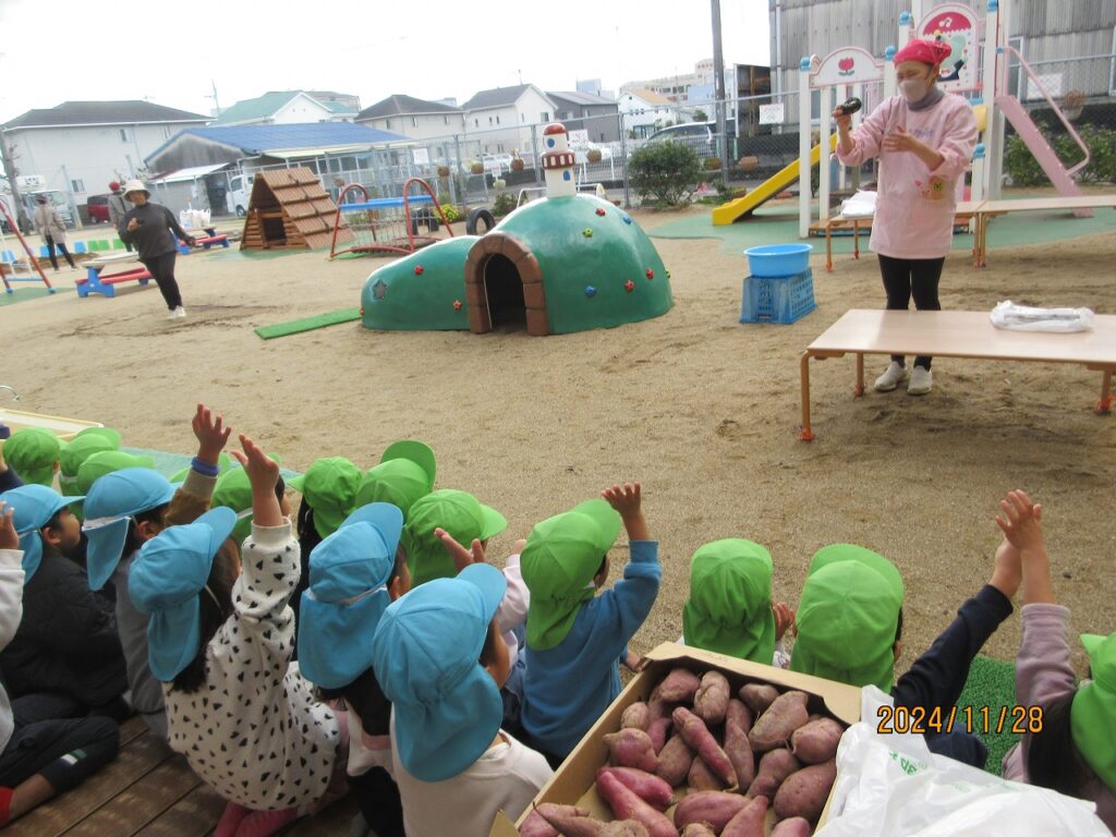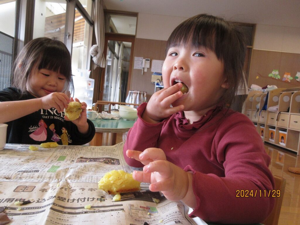 パチパチと落ち葉の焼ける音、煙たい匂いに『すごい音!』『くさ~い😭』『涙がでる』と美味しいものを食べるまでの苦労も知りました。(笑)モクモク…煙の立つ落ち葉の中にいもを投げ込みます。待つこと50分‼ホクホクの美味しいやきいもの完成です😊『おいし~❤』と最高の笑顔が見られました。普段はさつまいもが苦手な子もペロリと完食し、おかわりをする子も!!育てるところから始まり、収穫、準備と過程を知り、様々な経験を経て自分たちで作ったやきいもの味は格別でした。ご家庭でも話を聞いてあげて下さい!
