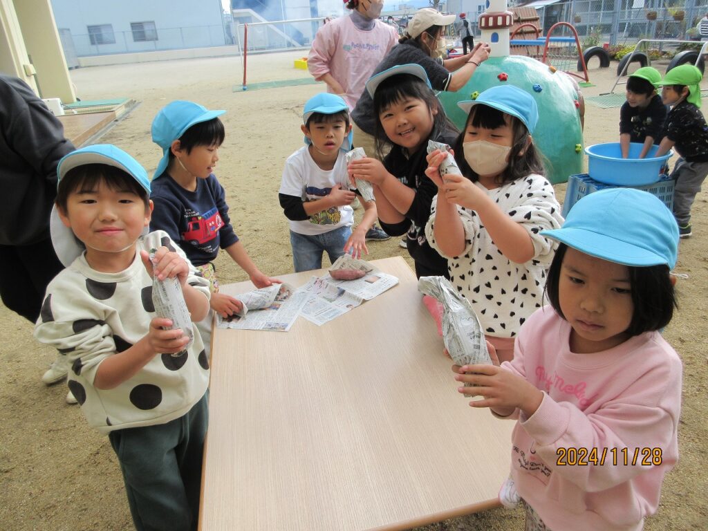 天候が不安定でしたが、みんなの“早く食べたい”という思いが届いたのか、お天気になり待ちに待っていたやきいもの日です。まずは、新聞紙でいもを包みます!次に水にくぐらせ、やきいも専用アルミホイルで包みます。『上手にできた』とみんな嬉しそうです。