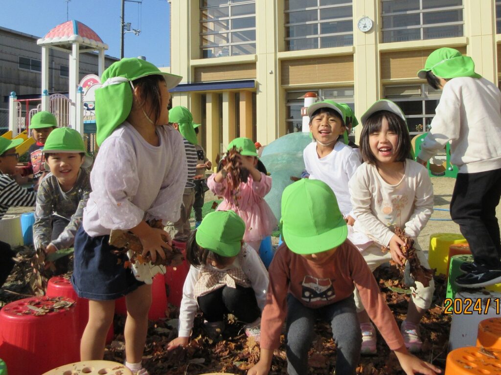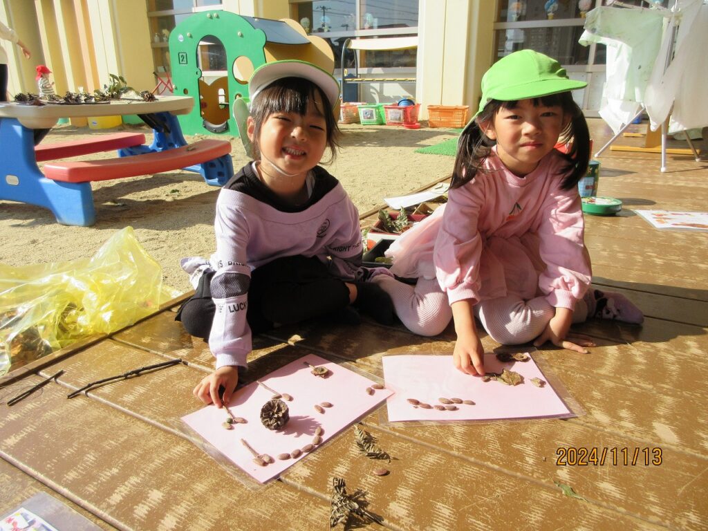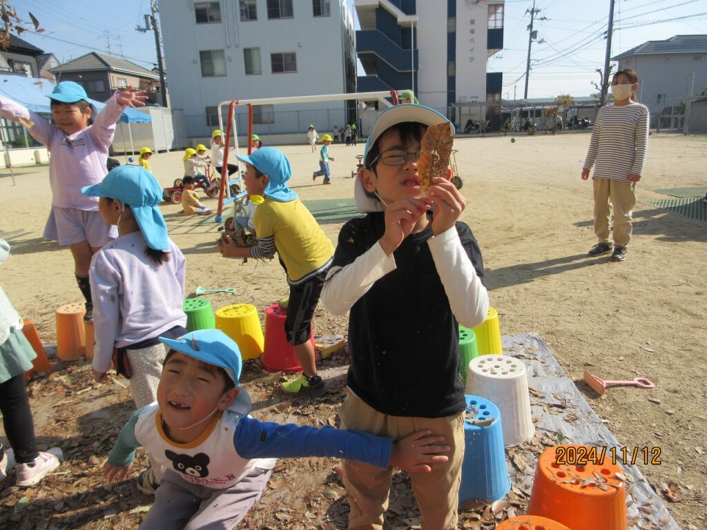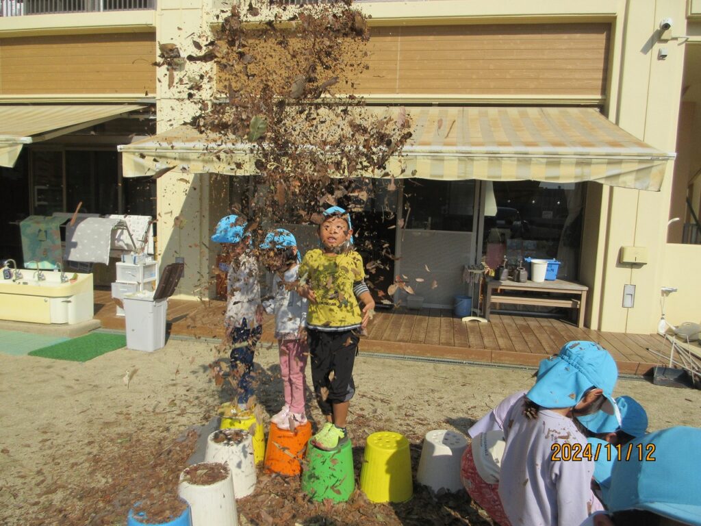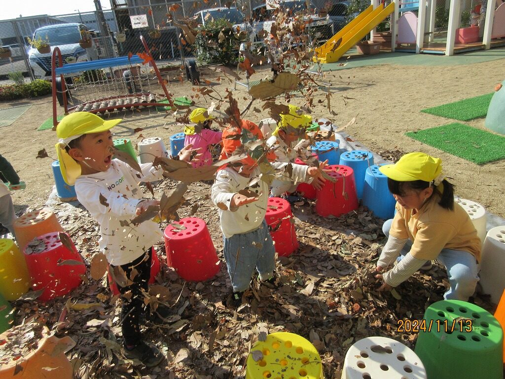 2024.12.12ぴよぴよ 秋のあそび(あひる・ぺんぎん・らいおん) 全身で秋を感じていた子どもたち。「いろいろな葉っぱがある!」「シャワーだぁ~」「なんか匂いがする」と葉っぱを巻き上げ葉っぱのプールで大はしゃぎで遊びました。また、まつぼっくりや木切れを組み合わせ虫や花など素敵な作品を作り上げ、秋あそびを満喫することができました。子どもたちの自然で遊ぶいい笑顔をご覧ください。