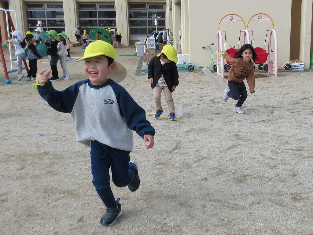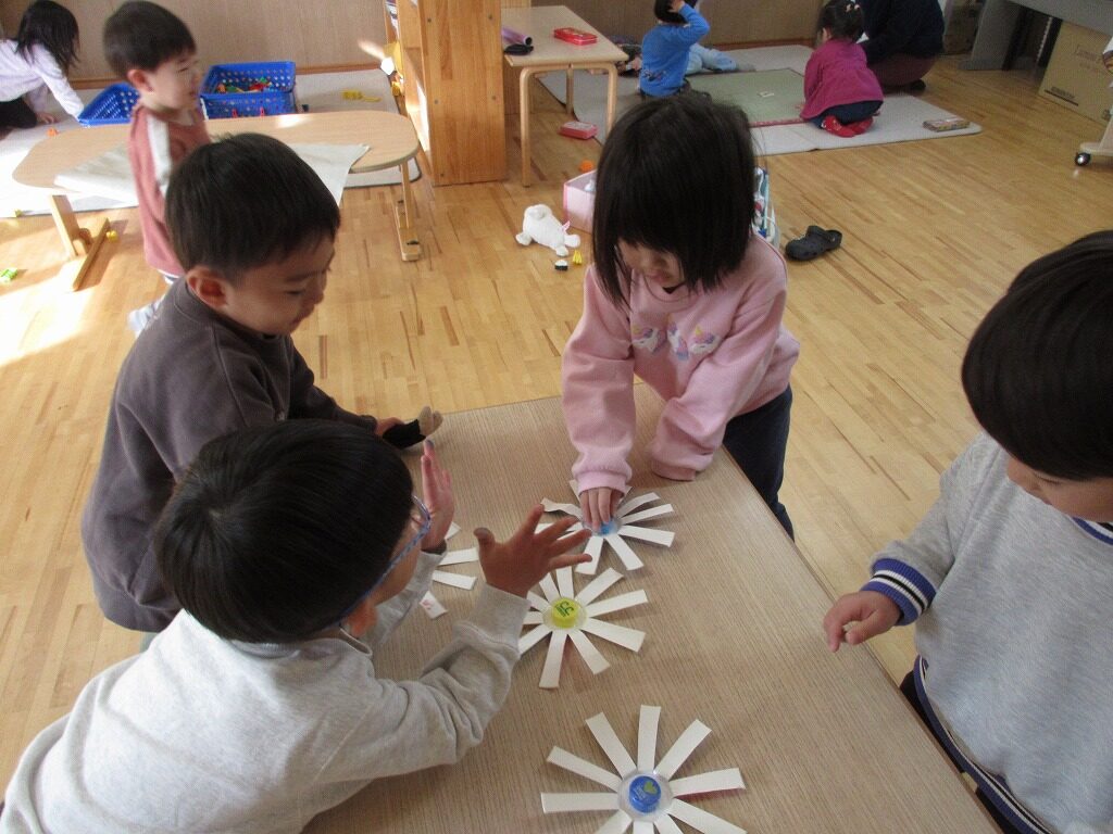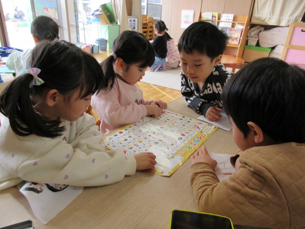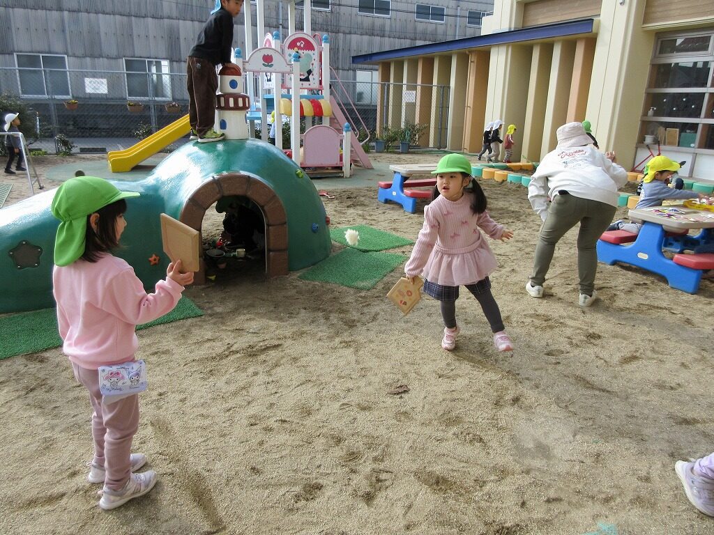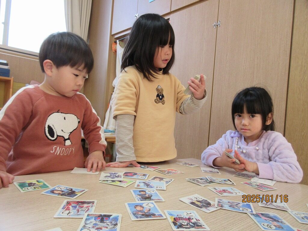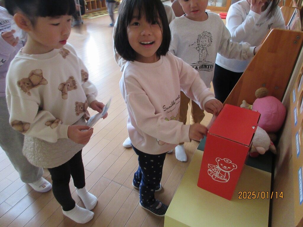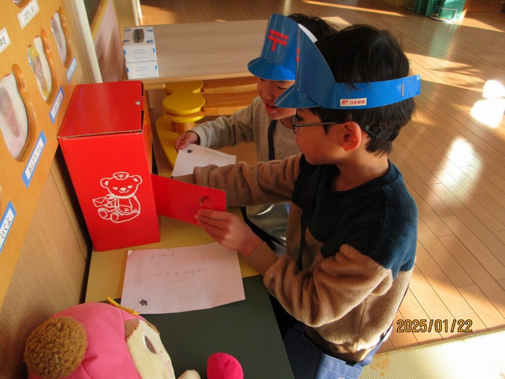 友達と一緒に紙コップで作ったこまを回したり、かるたとりをしたりして楽しみました!かるたとりでは、ひらがなに少しずつ興味が出てきて、ひらがなの形を見て絵札を取る姿が見られました。友達より先に取ろうと必死になって取っています。たこあげでは、「早く走って」「手は上よ」と友達とどうしたら高く上がるか話をしながら遊ぶ子どもたち。高く上がるとみんなで手を叩いて喜び合っていました。年賀状からお手紙に興味を持ち、らいおん組さんが郵便屋さんとなり郵便ごっこが始まりました。「この字はどうやってかくの」と友達と一緒にあいうえお表を見ながら手紙を書いています。お手紙届くかな✉❤