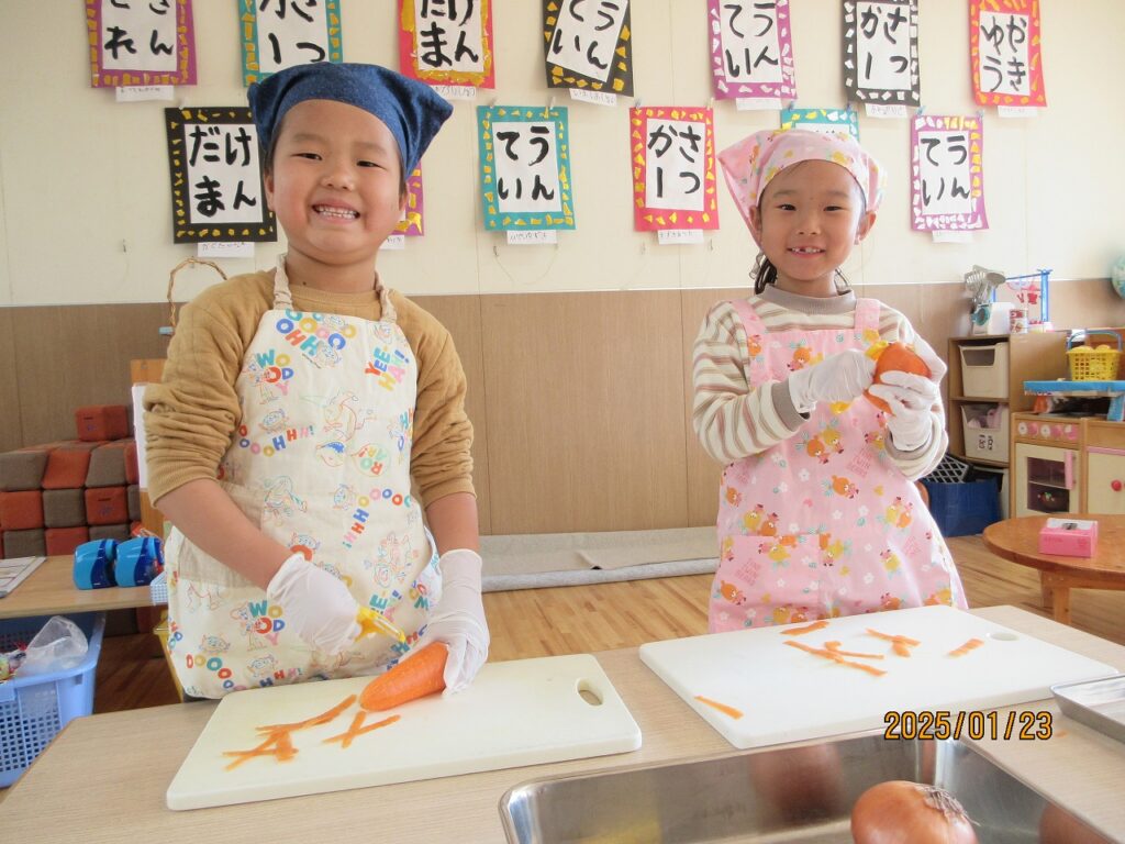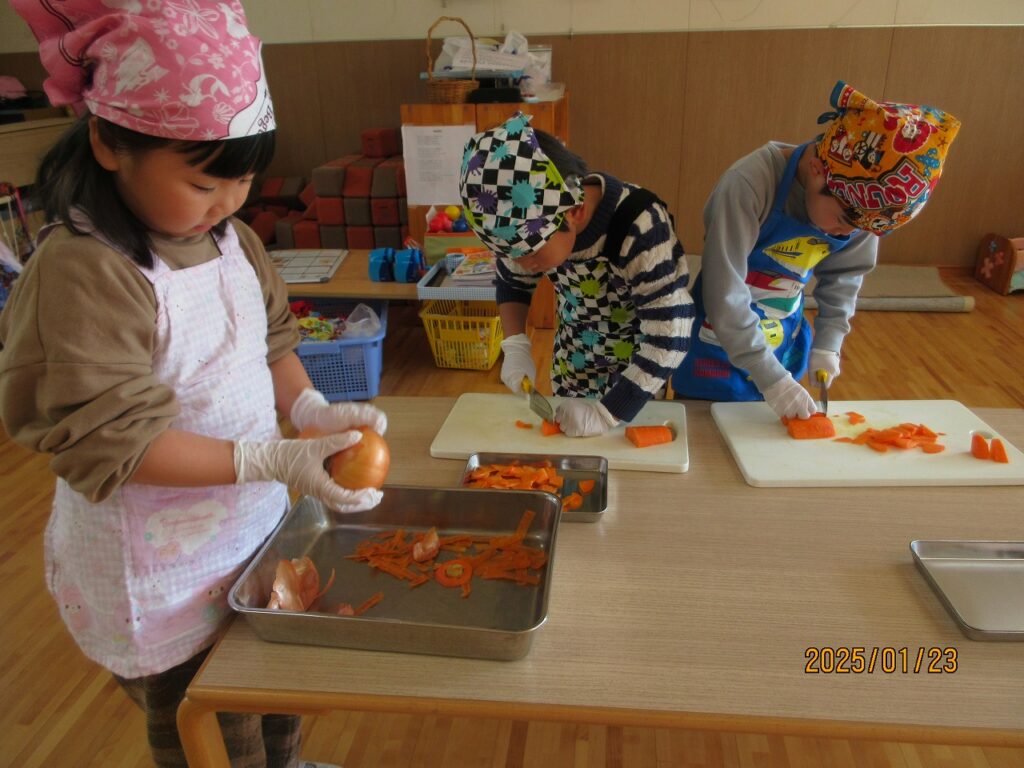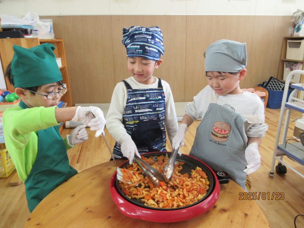 みんなで何を作りたいか決めるところから始まった料理活動。子どもたちから作ってみたいメニューの案がたくさん出され「いっぱい作りたいけど、どうする?」と悩む子どもたち。「お弁当にすれば沢山作って食べられるんじゃない⁈」と少しヒントを出してあげると、全員が「いいねー!!」とすぐお弁当に決定ました!