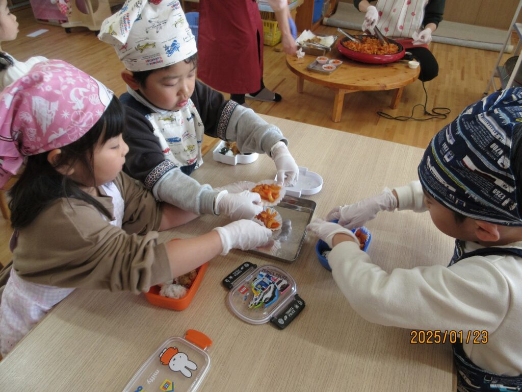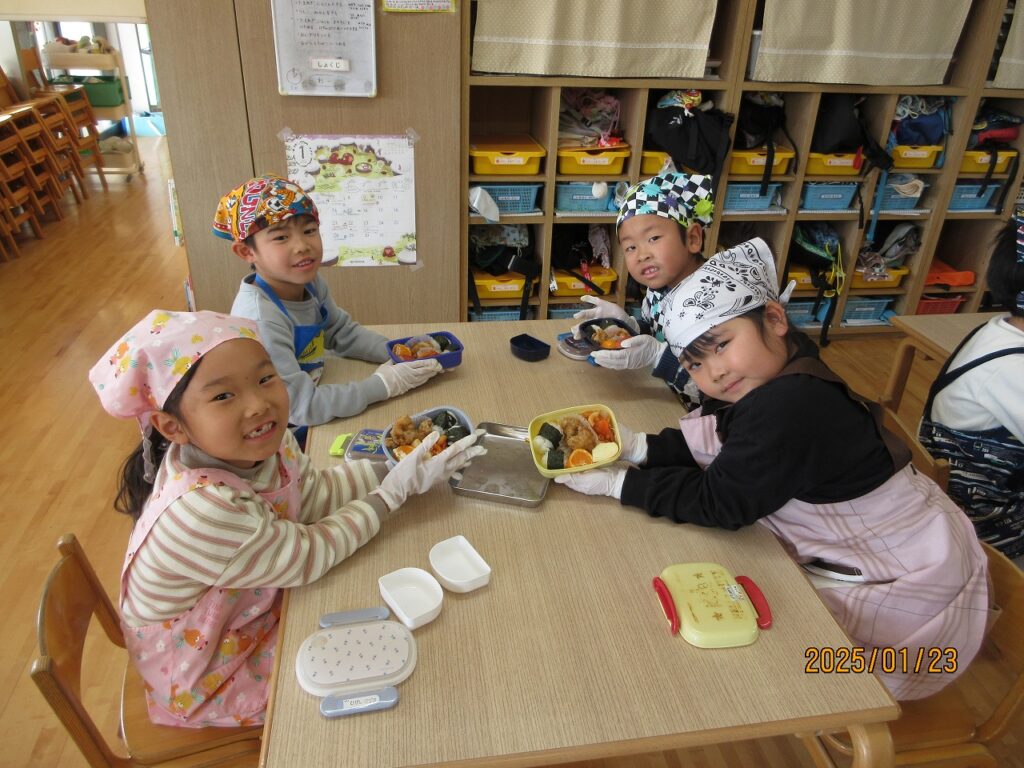 料理活動では、これまでの園での料理の経験や家庭でのお手伝いの成果などもあって、得意気に料理をする姿を披露する子どもたち。しかし、一番大変そうだったのがお弁当箱の中へ出来上がったおにぎりやおかずを詰める時でした。苦戦しながらもそれぞれ完成したお弁当が出来上がると、とても嬉しそうな子どもたちでした。
