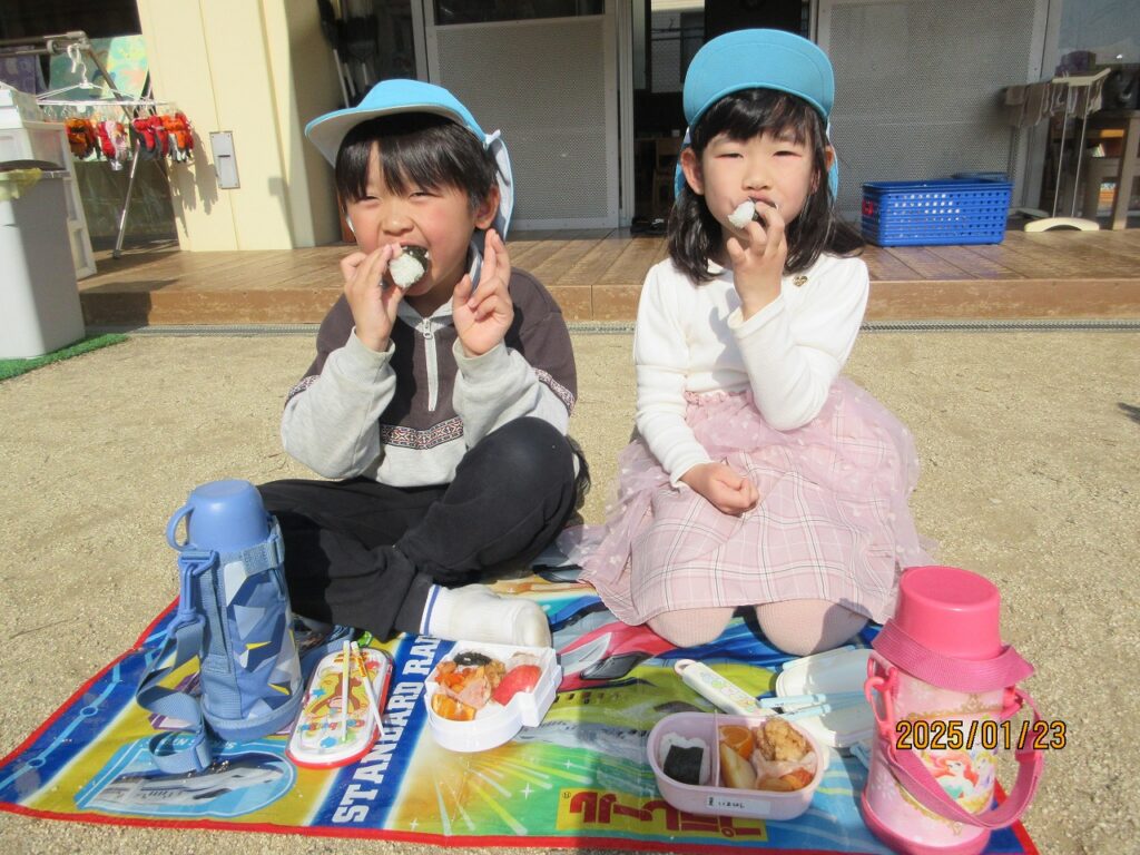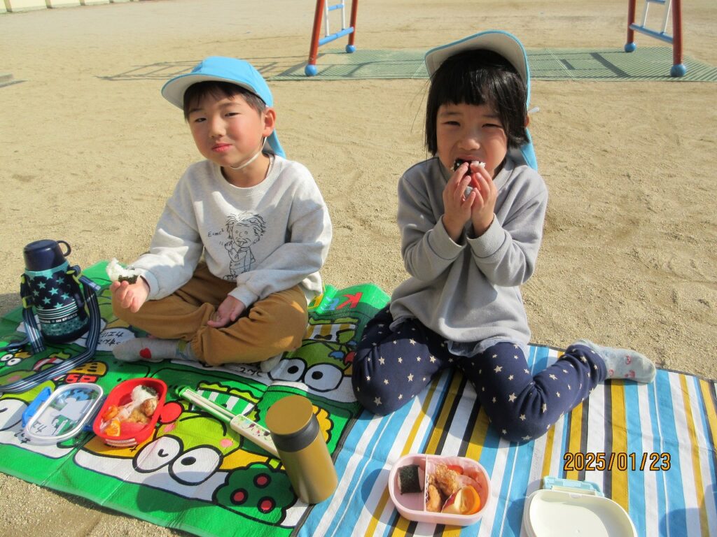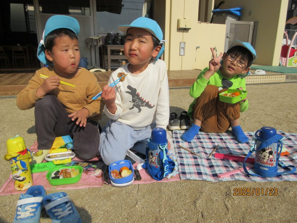 子どもたちから「お弁当、お外で食べたい!」「レジャーシート持って来るねー!」と気持の良い園庭で食べることになりました。今回は子どもたちの様々なアイデアが形となり、素敵なランチタイムとなりました♪
