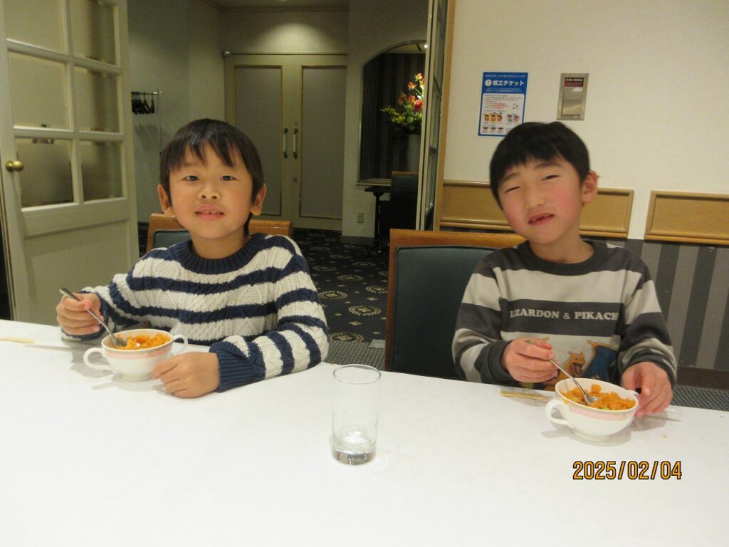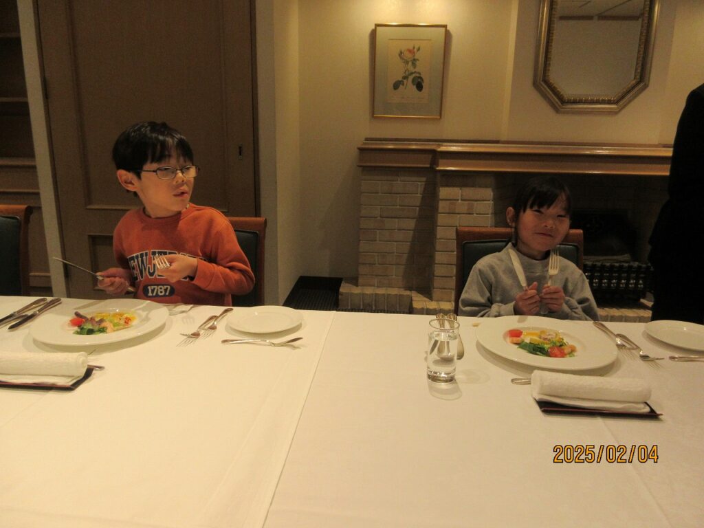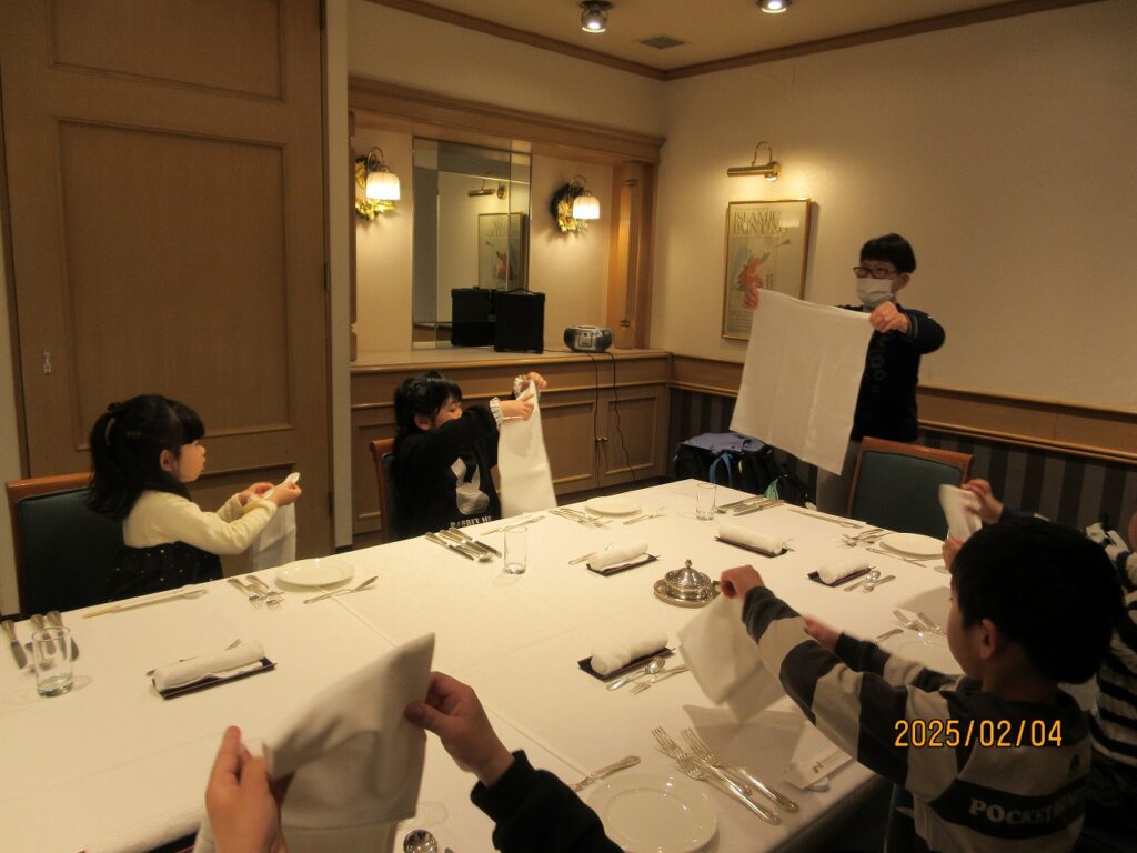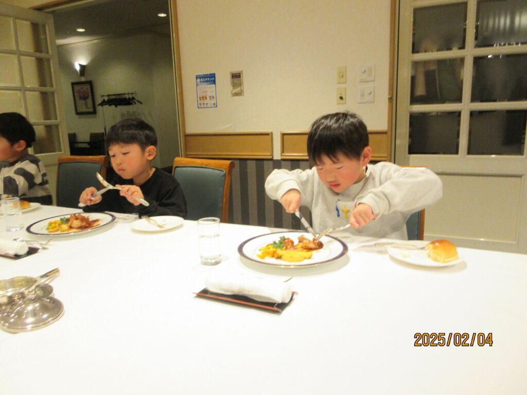たくさん身体を動かした後はホテルへ移動し、園長先生にテーブルマナーを教わりながらフルコースを頂きました。ナイフやフォーク、ナプキンなどいつもとは違う環境に緊張した様子でしたが、緊張が解けてくると「エビ嫌い」「野菜食べれん」と苦手な食材を言い出す子どもたち。。。苦手な食材が多い子もいましたが「全部おいしかったー」の声も聞こえてきてお腹いっぱいになりました。