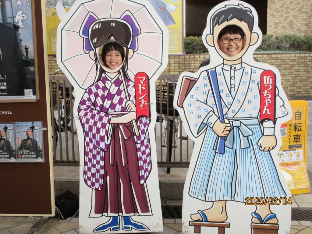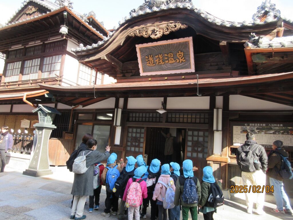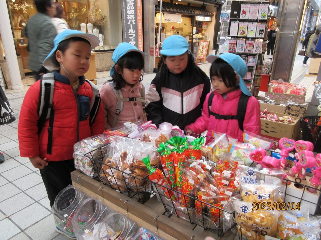 お腹がいっぱいになった後は、電車に乗って道後温泉へ向かいました。足湯に着くと雪がチラつき始めましたが、寒がる姿も見せずみんなでわいわいと足をつけて「あったか~い」と大喜びの子どもたちでした。道後商店街では、思い思いに好きなデザートを選び買って帰りました。すぐにデザートを決めて買う子もいれば、中々決められずにしばらく悩む子もおり貴重な経験になりました。
