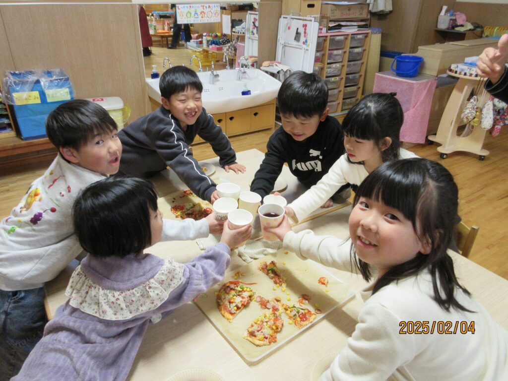 園に着くと、少し休憩してから夕食作りがスタートしました!!事前にみんなで案を出し合いピザを作る事に決まると、トッピングする具材を考えたりマルナカへ買い物へ行ったりとピザ作りをとても楽しみにしていました。友達と協力しながらこだわって作ったピザはとても美味しかったようで、お昼にフルコースを食べてお腹いっぱいだったはずですが、おかわりの声が止まりませんでした(笑)