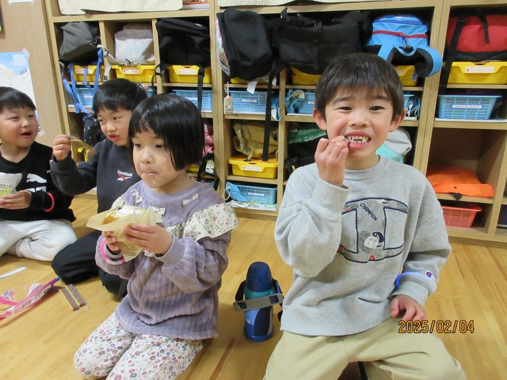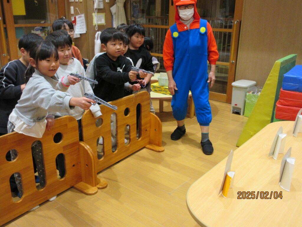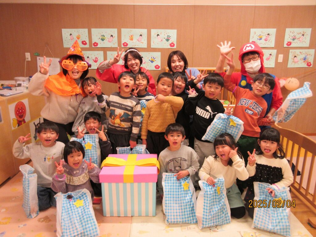 夕食の後は子どもたちが楽しみにしていた「おたのしみゲーム」の時間がスタートしました。二階の部屋全部を使い、光るうで輪釣りや輪投げ、射的や宝探しなど盛りだくさんの遊びに大興奮の姿が見られました。友達と力を合わせて一つずつミッションをクリアして宝箱の場所を探し出すと「やったー!」と大盛り上がり。最後は道後で買ったデザートを食べながら全員で一日を振り返りました。「またハッピーデーしたい」「巻き戻ししたーい」の声に子どもたちの満足だった様子が伝わり、楽しい思い出がまた一つ増えたらいおん組さんでした。