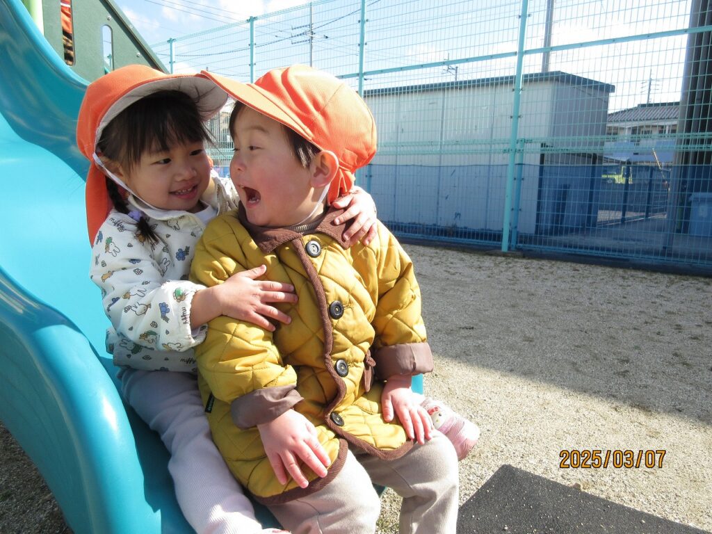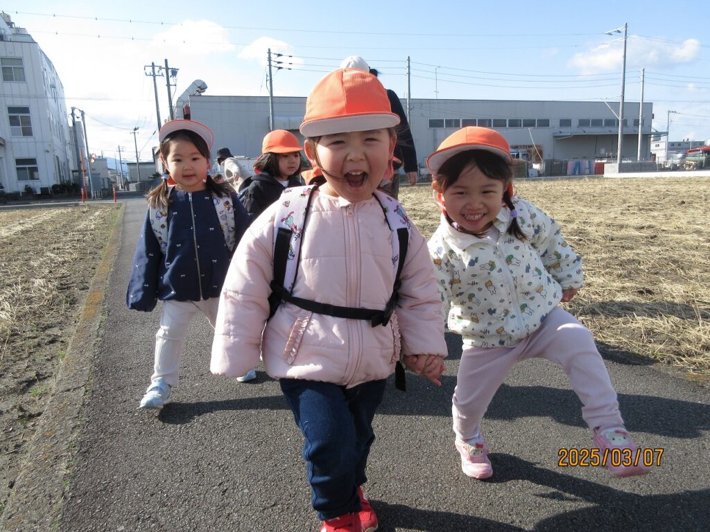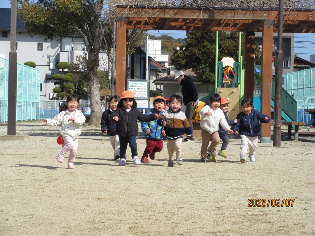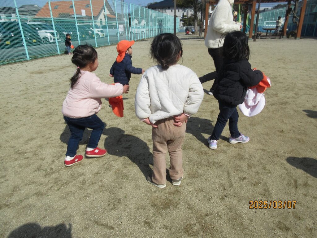 楽しみにしていた園外遊び。風が冷たかったものの、お日様ポカポカいい天気。歩いていると暖かく感じるほどでした。南斎院公園に行きましたが、行き慣れている公園ということもあって足もぐんぐん進みます。初めていった時に比べて歩くのも上手になり予想以上に早く到着しました。公園に到着してから2歳児さんがリュックに入れて持ってきてくれたリンゴジュースを飲んでパワーチャージ。すべりだいやブランコで遊んだり、帽子を使ってしっぽ取りをしました。