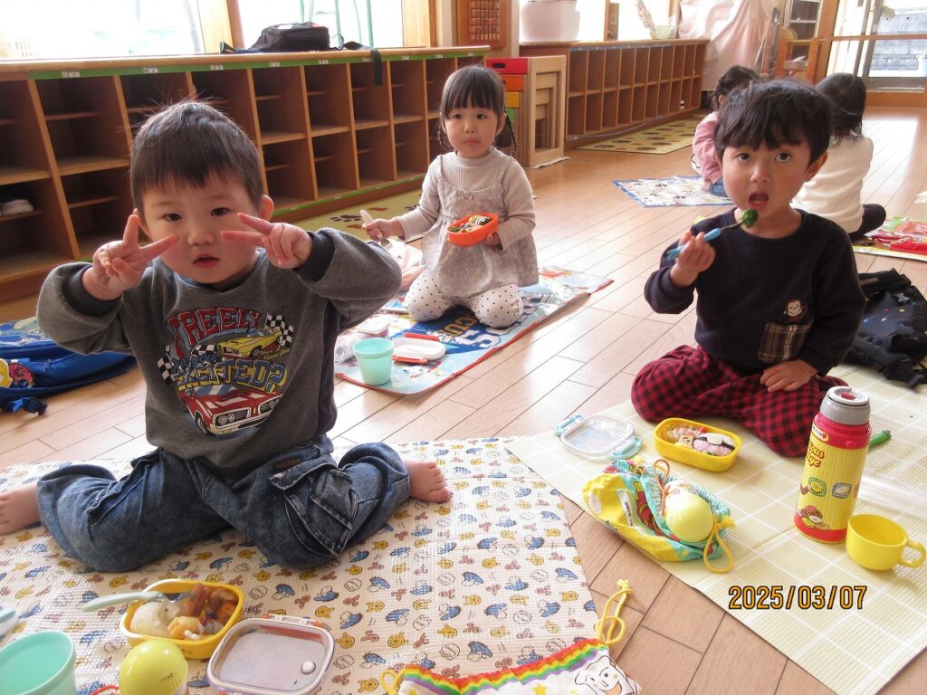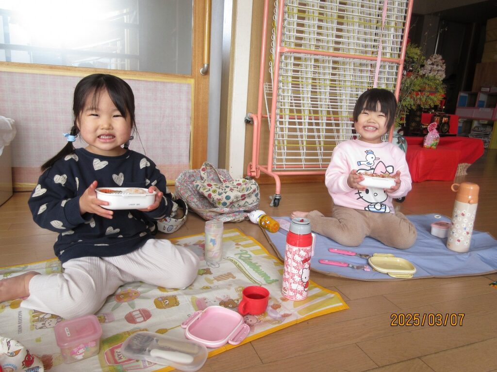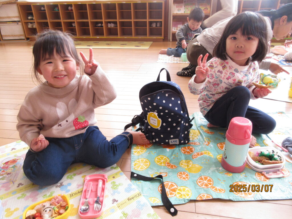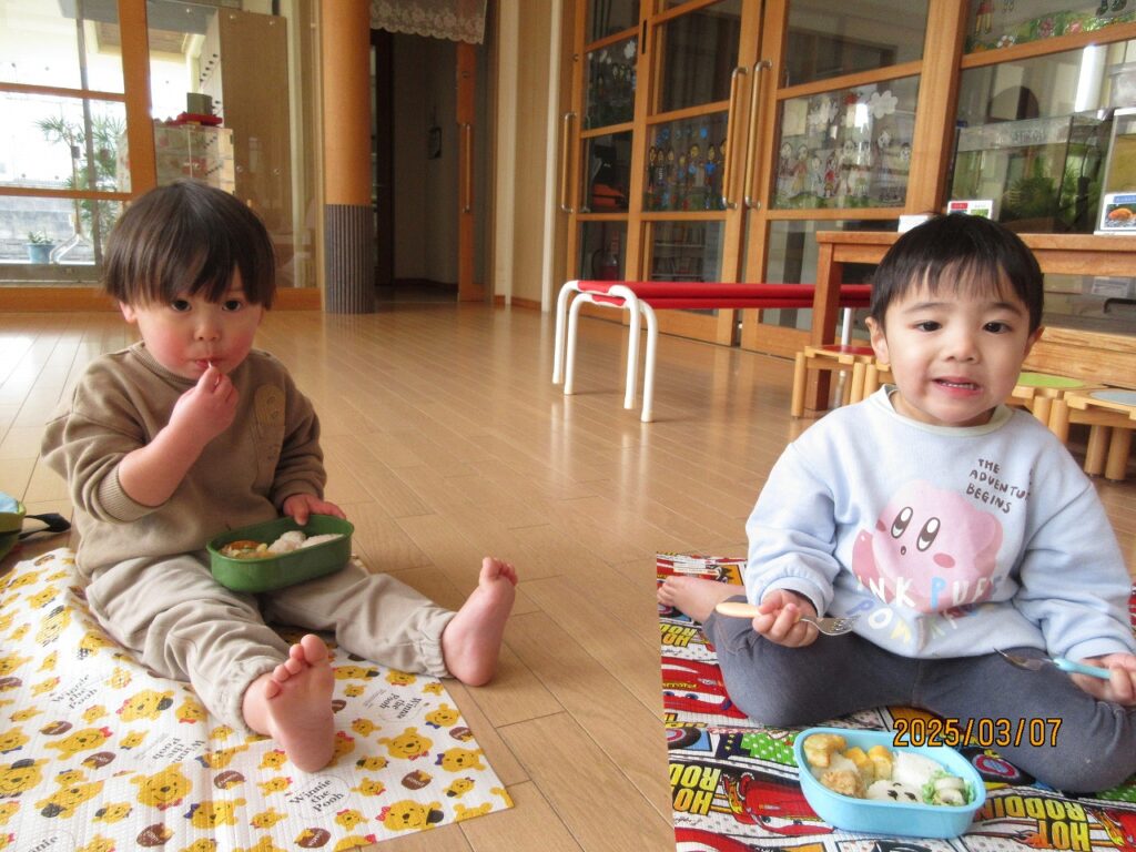 たくさん遊んでお腹もペコペコ。朝から「早く食べたい」と楽しみにしていたお弁当の時間がくると「見て~」と嬉しそうにお弁当を見せてくれました。エントランスにシートを敷いて食べましたが思っていた以上に上手に食べることができました。機会があればもっと暖かい日にお外でお弁当が食べられたらいいな。