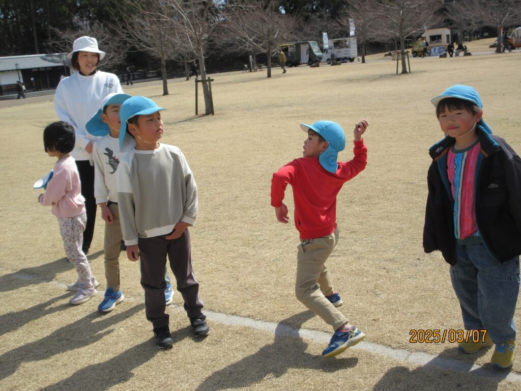 松山城を下りた後は城山公園で遊びました。お城で拾った松ぼっくりを投げる競争、みんなが大好きでいつもしている鬼ごっこやこおり鬼をしました。保育園でするいつもの遊びなのに、とっても広い城山公園では逃げ回れる広さが違ってなかなか捕まえることが出来ません💦「もう!!全然つかまら~ん。」と息を切らせながら諦めてしまう友達もいましたが、友達や保育士と一緒にのびのびと走り回れたことがとても楽しかったようです。