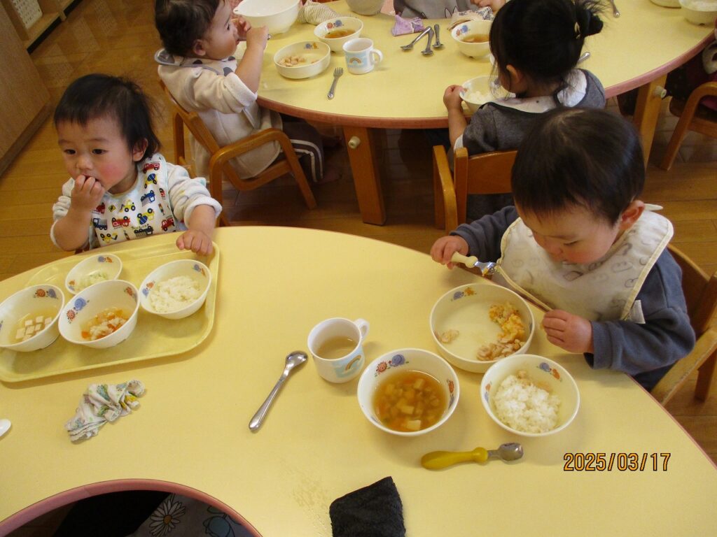 何でもよく食べるこあら組さん。スプーン・フォークを使えるようになり、月齢の小さいお友達は手づかみ食べで毎日完食しています♪