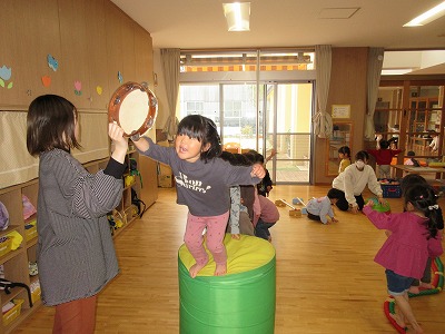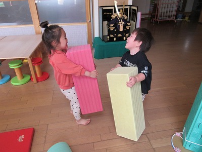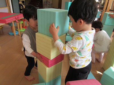 天気の悪い日には、室内でロープや飛び石などを準備して落ちないように歩いたりタンバリンをめがけてジャンプしたりとサーキット遊びを楽しんでいます。また、エントランスでは、大型積み木を使い友達と協力しながら積み木を積み上げたり一緒に運んだりと子どもたちなりに工夫しながらダイナミックに遊ぶ姿に逞しさを感じます。