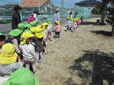ぺんぎん組さんと一緒に南斎院公園にお散歩へ出掛けた際には、手の繋ぎ方や歩き方をお兄さんお姉さんに優しく教えてもらいました。公園では、一緒に遊具で遊んだり鬼ごっこや虫探しなどをしたりしていた子どもたちですが、いつも以上に異年齢児との関わりを喜び、楽しそうに遊ぶ姿が見られました。