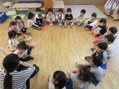 友達の後ろに順番に並ぶことやしっかりと手洗いや歯磨き、うがいをすることなど、自分の身の回りの事に興味を持って取り組むことが出来るよう日々友達と一緒に取り組んでいます。また、集まりの際には、自分でマットのボタンを留めたり外したりして準備をし、その上で歌を歌ったりして楽しみながら意欲的に活動しています。
