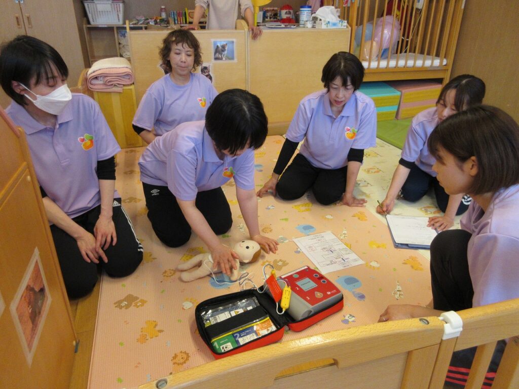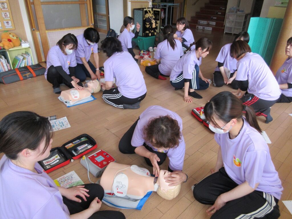 まずは、普段園が行っている重大事故対応(誤嚥・窒息)による心肺停止時の訓練の様子を見ていただきました。AEDを置く位置、絶え間なく心肺蘇生を行う為の職員の位置等再確認しました。分からないことを質問しながら一人一人が真剣に学びました。