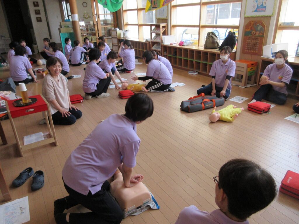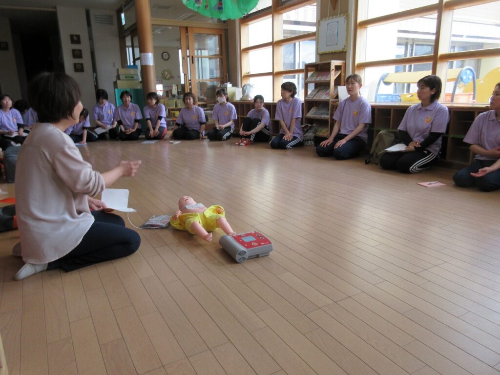 親子遠足終了後、日本赤十字病院の方を講師に招き、救命講習を実施しました。園生活における事故防止についての知識と技術を学び、子どもたちが安心して生活できるように毎年行っています。