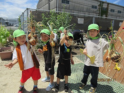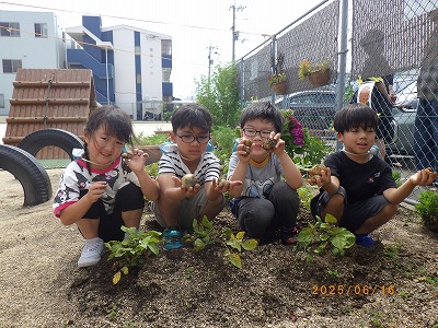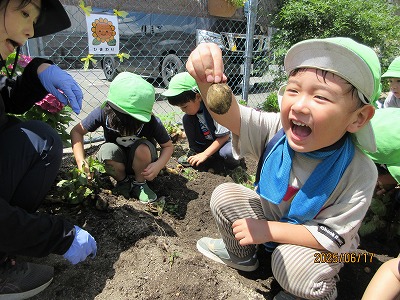 園庭で育てた野菜が今年は豊作で、驚くほど大きな玉ねぎとかわいいジャガイモがたくさん収穫できました。この野菜を使ってみんなでカレーライスを作りました。