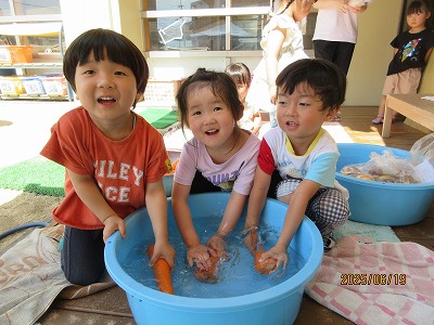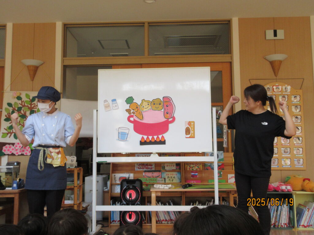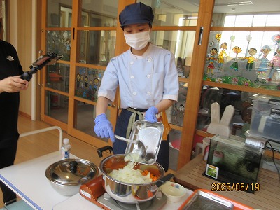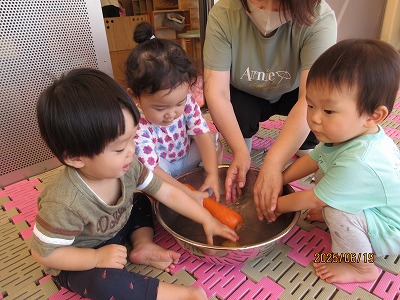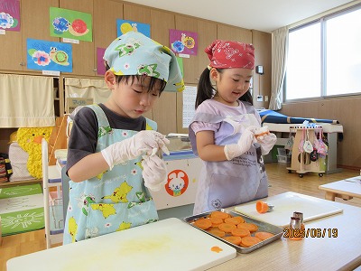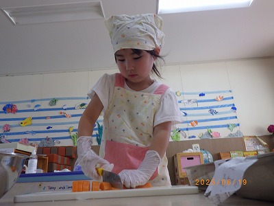 りす組、あひる組は、にんじんとじゃがいもを「ごしごし」と水遊びの延長で楽しく洗いました。あひる組は、玉ねぎの皮むきもしてくれましたよ。ぺんぎん組は、ピーラーを使って野菜の皮むきと型抜きを、らいおん組は、包丁で野菜を切ってくれました。安全に気を付けながら約束をしっかりと守って調理器具を扱うことができていました。