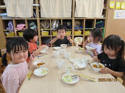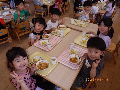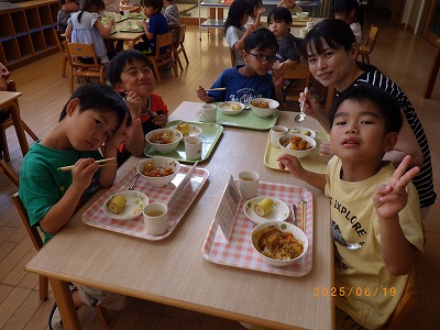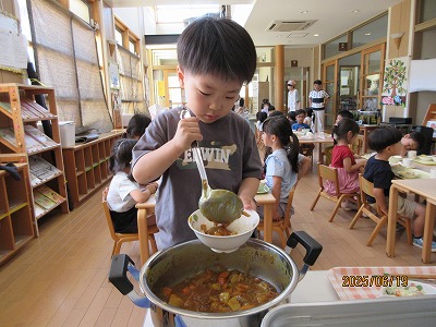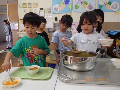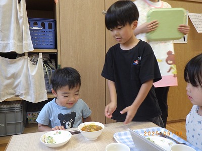 エントランスでの集会では、手遊びをしたりパネルシアターを見たり、みんなが頑張って下準備してくれた食材を調理の先生が目の前でライブクッキング。音や匂いを感じ「いい匂い」「早く食べたい」と気持ちも高まります。あひる組は、らいおん組にカレーをついでもらいました。こぼさずに上手につぐことができました。らいおん、ぺんぎん組は、エントランスで会食をしました。自分達で作ったカレーを自分でついで食べた感想は、もちろん「美味しい~♡」の一言に尽きます。
