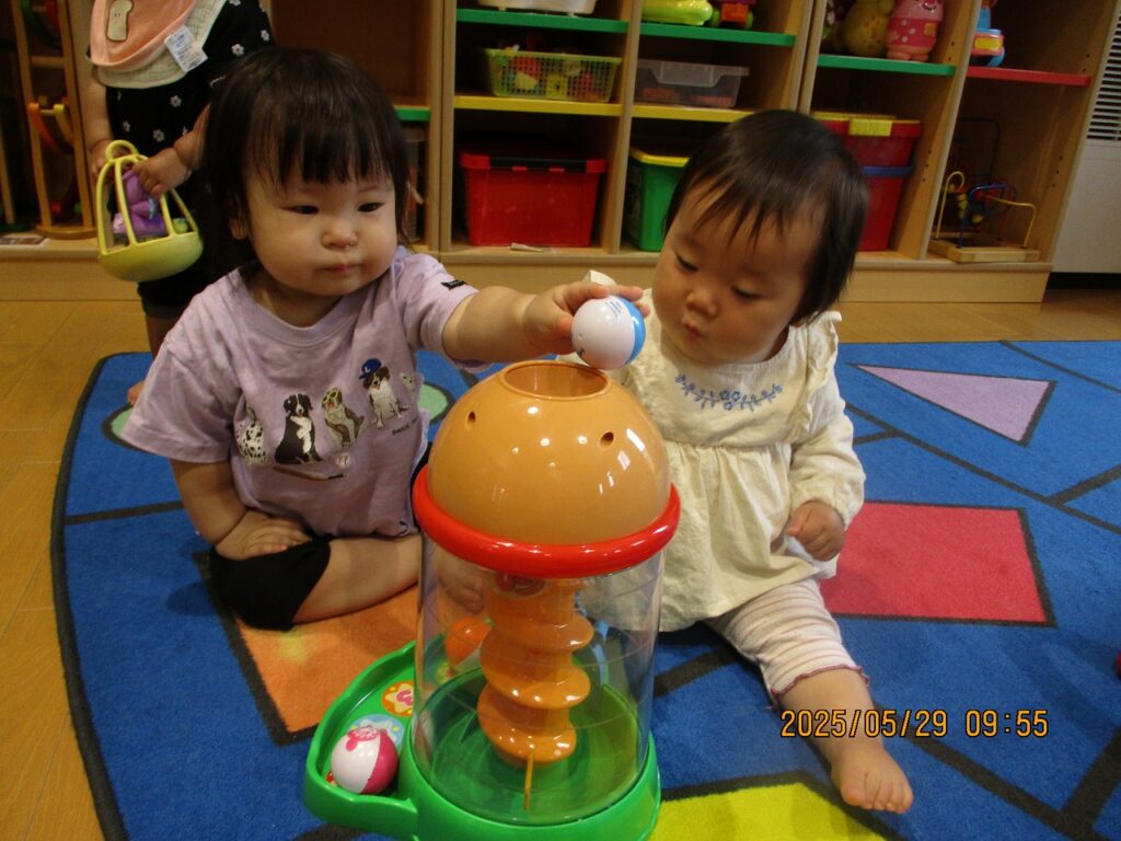 こあら組に新しいお友達が2人入ってきました。 初めは、泣くこともありましたが、新しいおもちゃに興味津々で友達と一緒に楽しく遊んでいます。