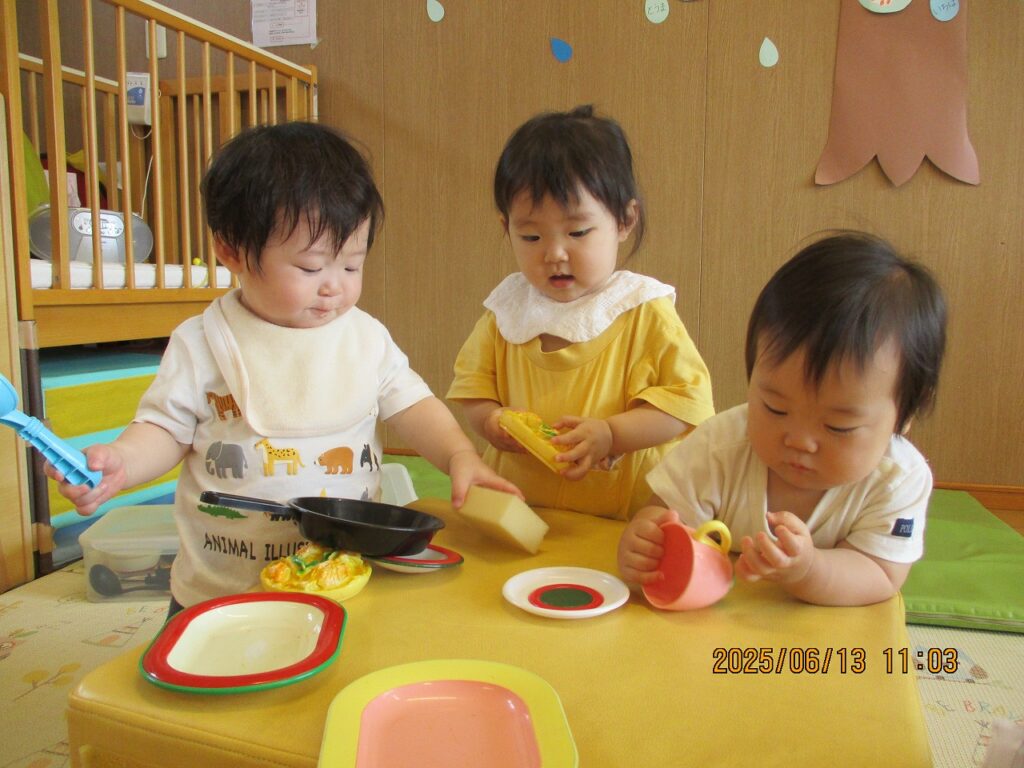 また、友達と一緒におもちゃを共有したり、ごっこ遊びをしたりして遊びを通してやりとりをする姿が見られるようになりました。