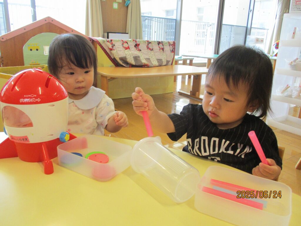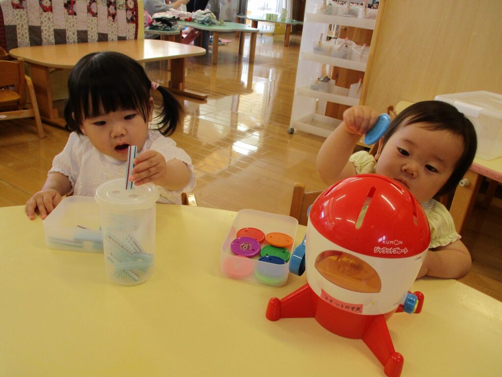 コイン落としやストロー落としなど机上遊びを楽しんでいます。集中して穴に入れようとして、繰り返し遊んでいます。