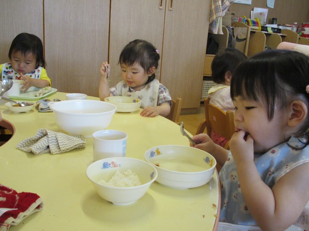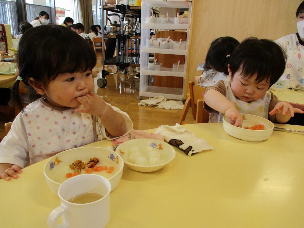 食事では、手掴み食べやスプーンを使って食べたりと、一人一人の様子に合わせて進めています。