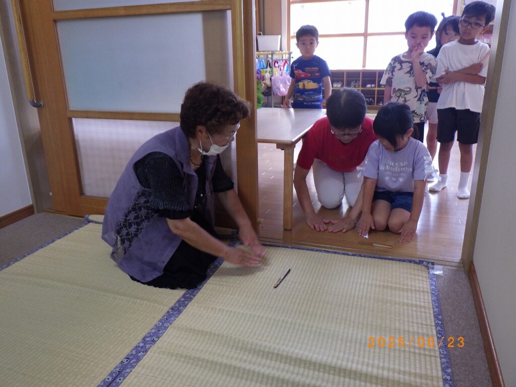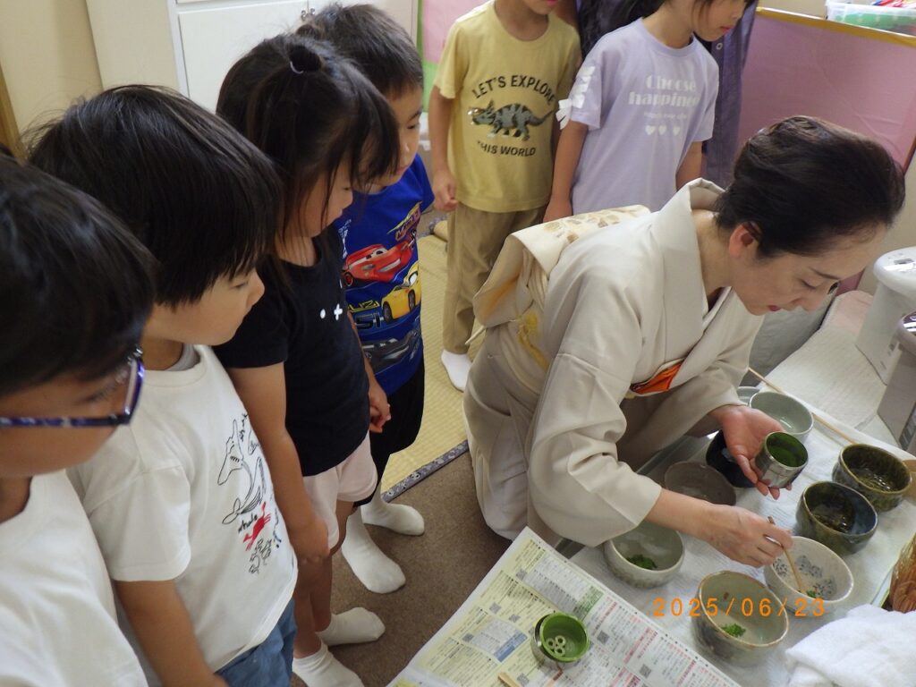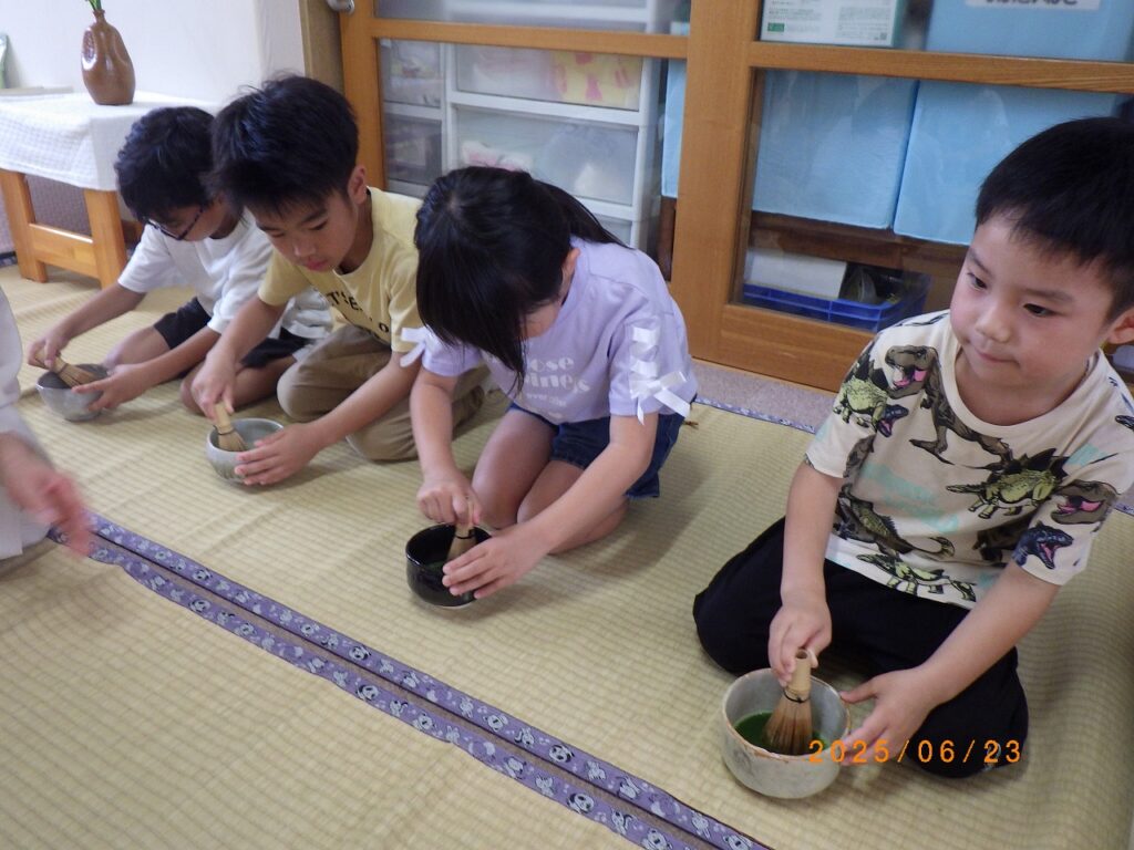 初めて【お茶の教室】がありました。ほとんどの子どもがたちが、抹茶を飲んだことがなく「どんな味がするのかな」と楽しみにしている様子でした。綺麗な着物を着た先生に緊張気味の子どもたち。部屋の入り方や、お辞儀の仕方をなど作法を教えてもらい、実際に自分たちでお茶を点てました。茶筅を一の字に上下に動かし、点てたお茶を飲むと「おいしい」「苦い」「舌が緑になった」など感想は様々でした。