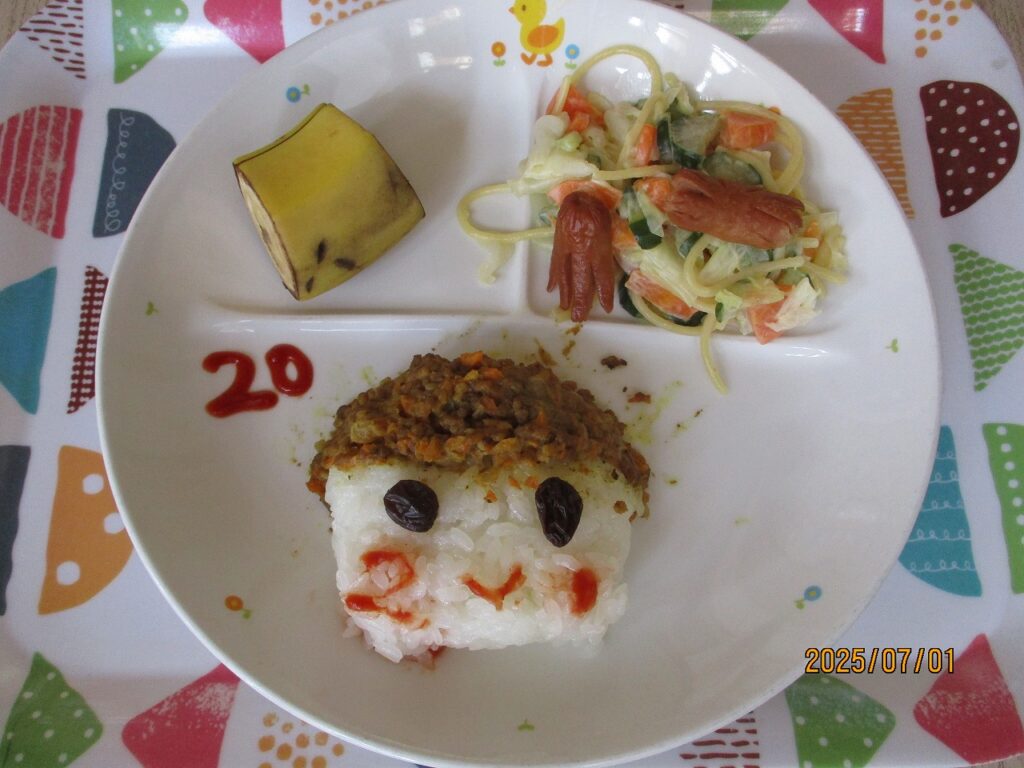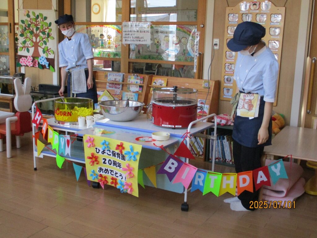 ひよこ保育園が誕生して20年。今日は、子ども達と一緒に「ひよこ保育園お誕生日おめでとう」の歌を歌ったり、20周年プレートのご飯を食べたりしてお祝いしました。
