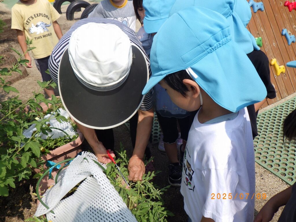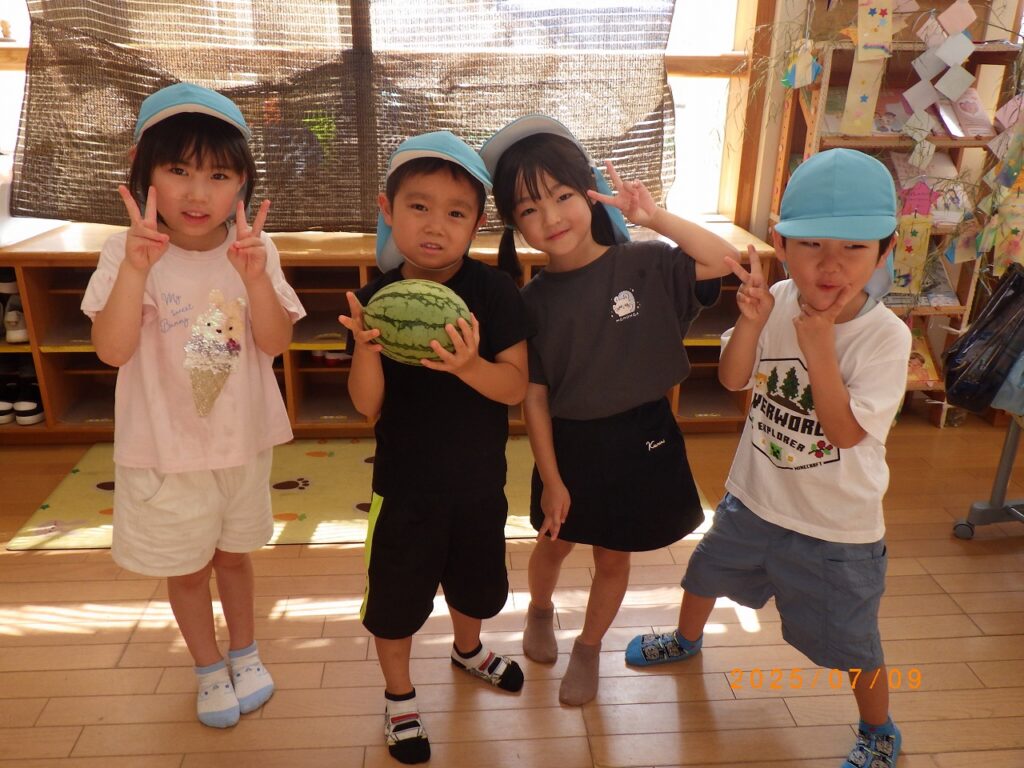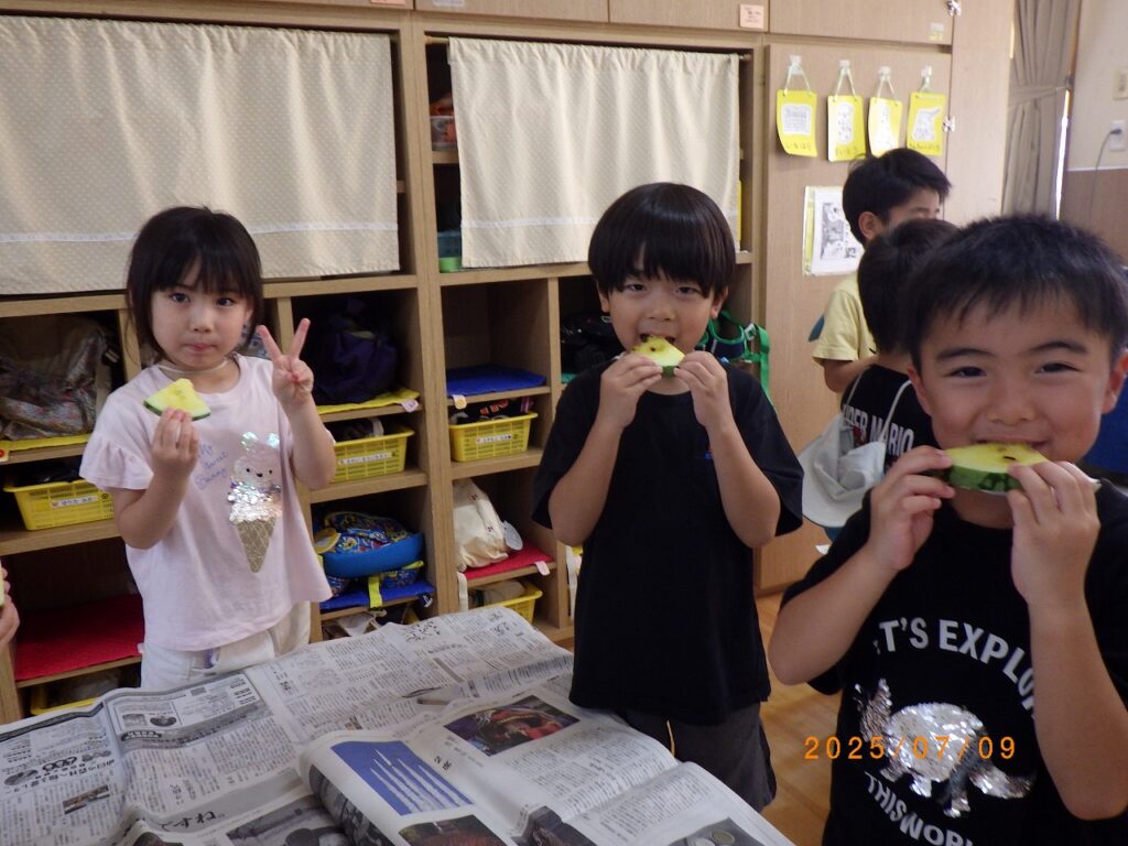 例年よりも早い梅雨明けで夏の暑さにピーマン・なすびは数個しか収穫できませんでした。トマト・とうもろこしは、残念ながら収穫前にカラスに食べられました。「スイカは食べるぞ!!」「いつ食べられるかな?まだかな、まだかな?」と楽しみにしていました。ついに、収穫の日!!園長先生が、出来具合を確認するためスイカを叩くと、ポンポンポンと良い音が♪切ってみると、きれいな黄色のスイカでした。初めて見る黄色いスイカに驚く子どもたち。中には「食べられるん」と心配そうに話す子どもも(笑)