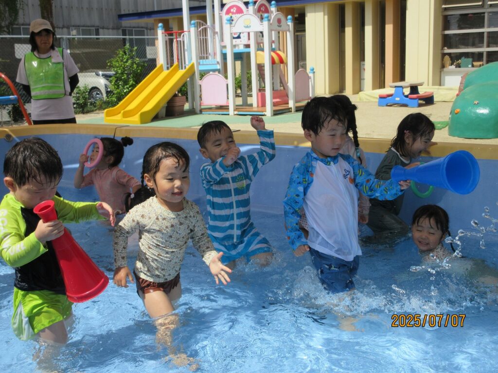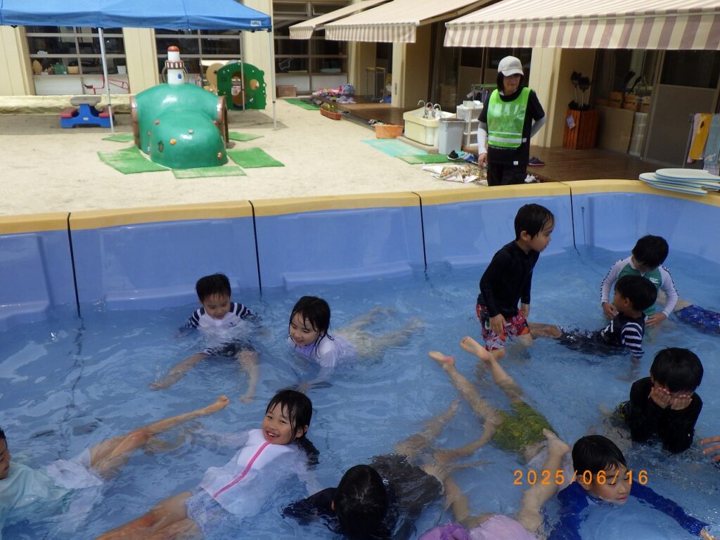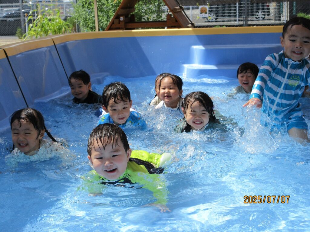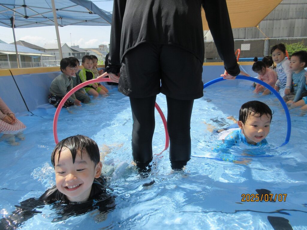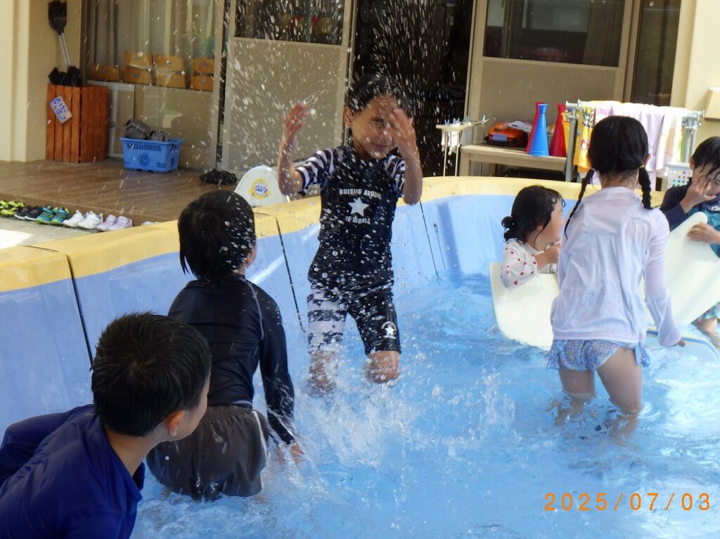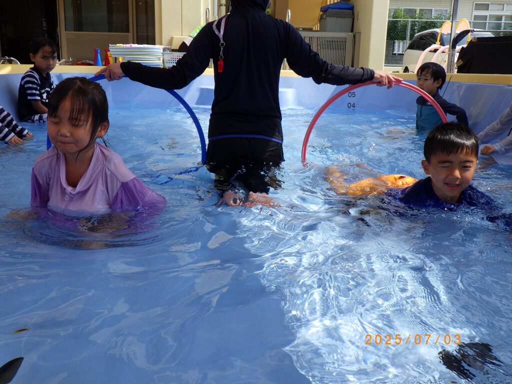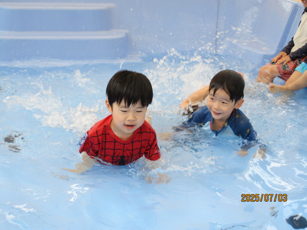 初めは顔に水がかかる事が苦手だった子も、水に慣れ少しずつ顔が付けられるようになっていきました。友達とプールの端から端まで泳いだり、体を浮かせる事に挑戦したりとできた事が自信に繋がり、ダイナミックに遊べるようになりました!残りのプール遊びも、元気いっぱい楽しんでいきたいと思います♪