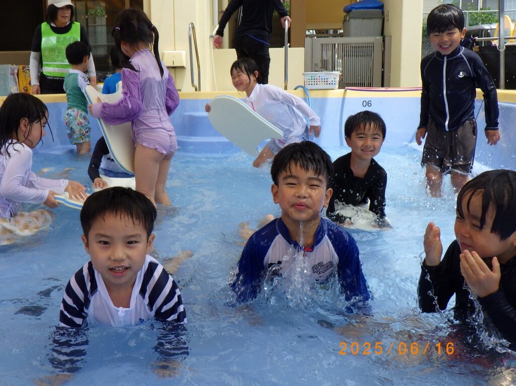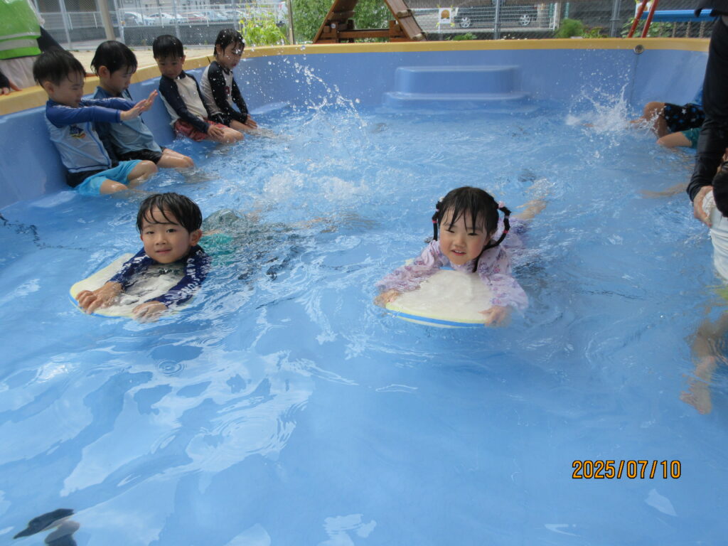 水しぶきが苦手だった子も、友達の刺激を受け、水に顔をつけられるようになりました。ビート板を使ってバタ足で泳いだり、中には水の中にもぐって平泳ぎをする子もいて、ダイナミックにプールあそびを楽しんでいます!泳げることが嬉しいようで「先生、見よって!」とみんなが泳ぎを見せに来てくれます。