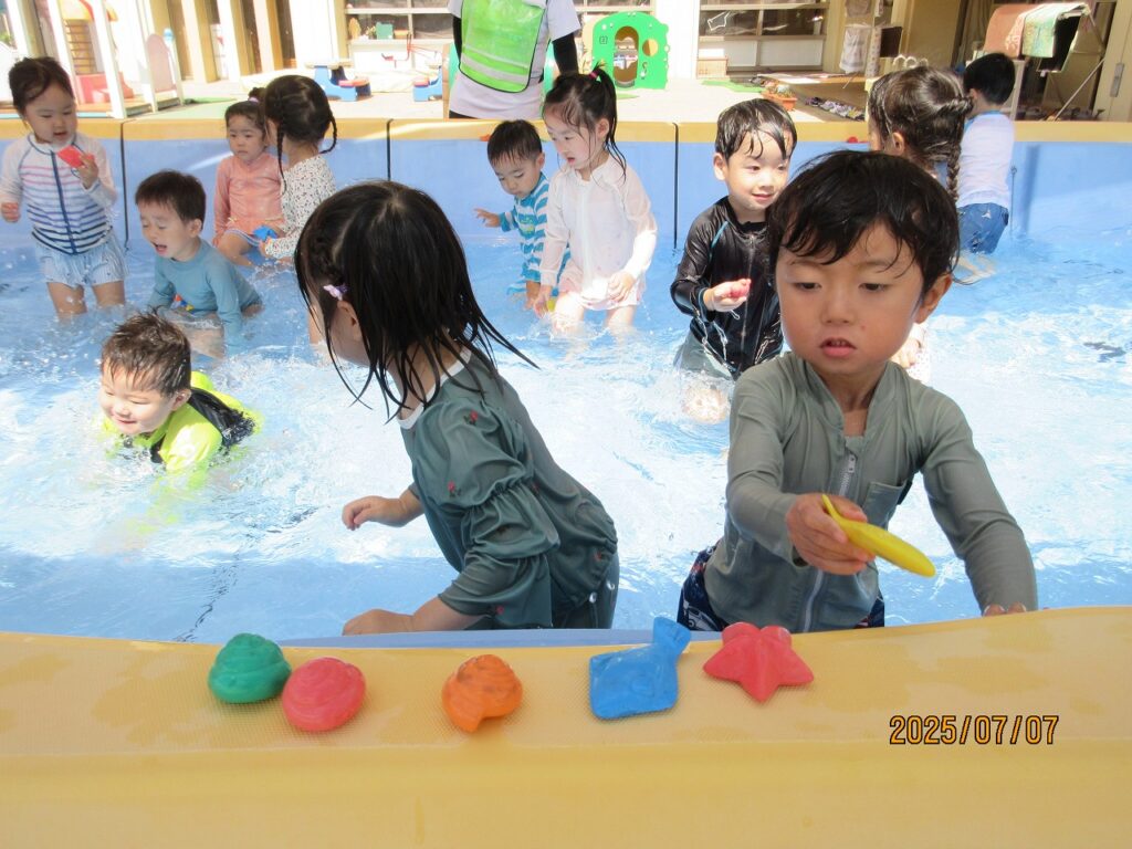 大きなプールが初めての子も多く、最初は、ドキドキとワクワクが入り混じり「プール苦手」という声も聞こえていましたが、いざプールに入ると「楽しい♪」とご機嫌のあひる組さん。顔に水がかかっても平気になり、ワニ泳ぎ、バタ足、宝拾いとみんな夢中になって楽しんでいます。苦手からできるようになり、『次はこれもやってみよう!』という気持ちがうまれ日々成長を感じます。
