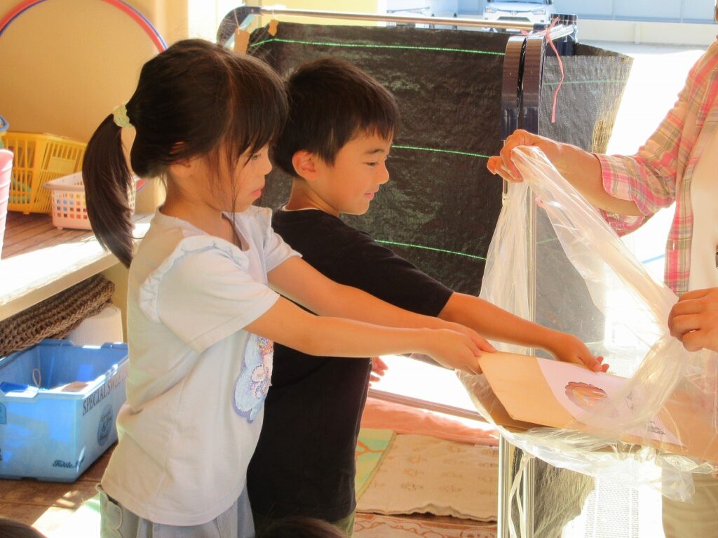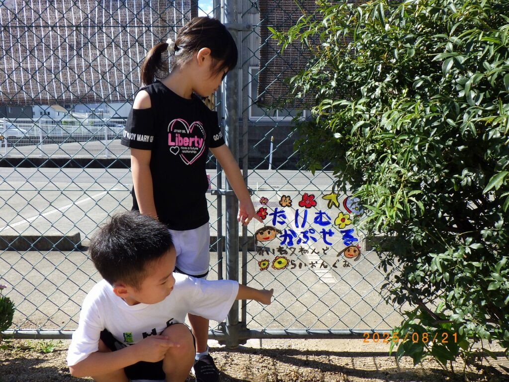 子ども達から「どこに埋めたかわからなくなるなぁ、どうしよう」という声が上がり、らいおん組さんが「それじゃあ看板を作ったらどう?」と提案してくれました。そして、らいおん組のみんなが協力して素敵な看板を作ってくれました。