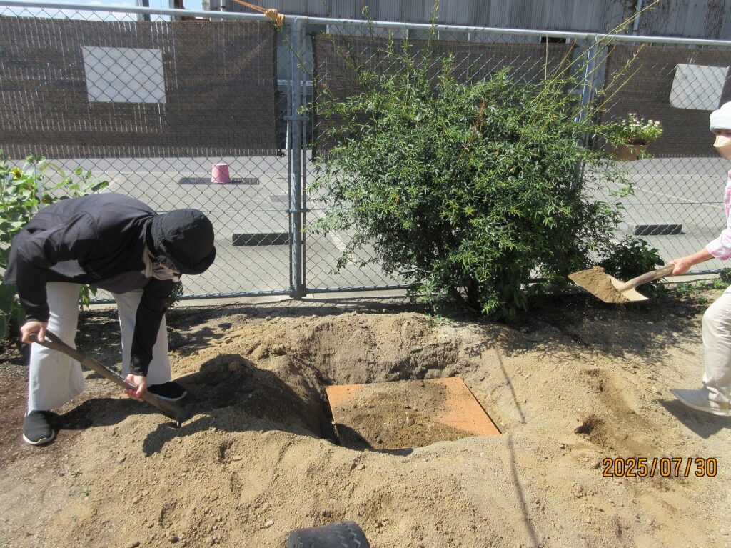 園庭のモッコウバラの根元に大きな深い穴を掘り、そこに埋めました。