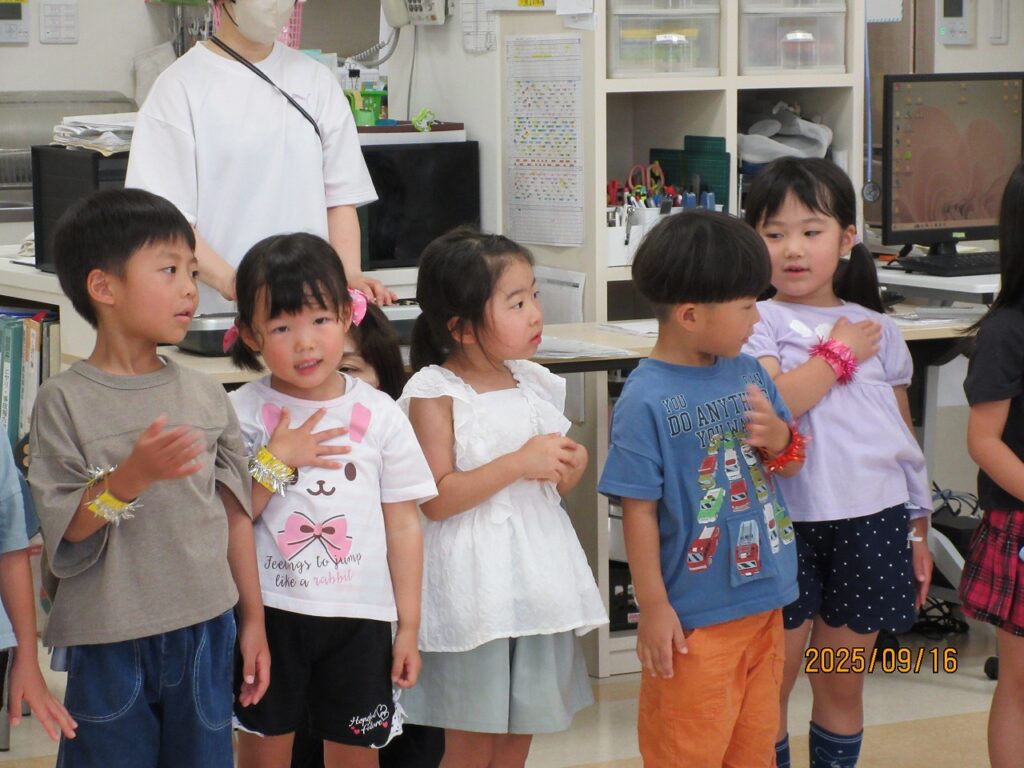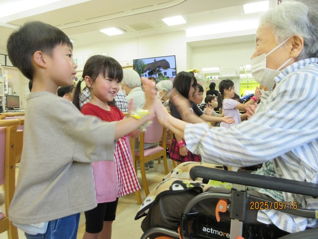 手を合わせたり握手したりして、おじいちゃんおばあちゃんの手に触れると「手が冷たかった」という子が多く、「おばあちゃんに『手があったかい』って言われたよ」と話す子もいたので、「今度行く時は、手を温めてあげよう!」と話しました。