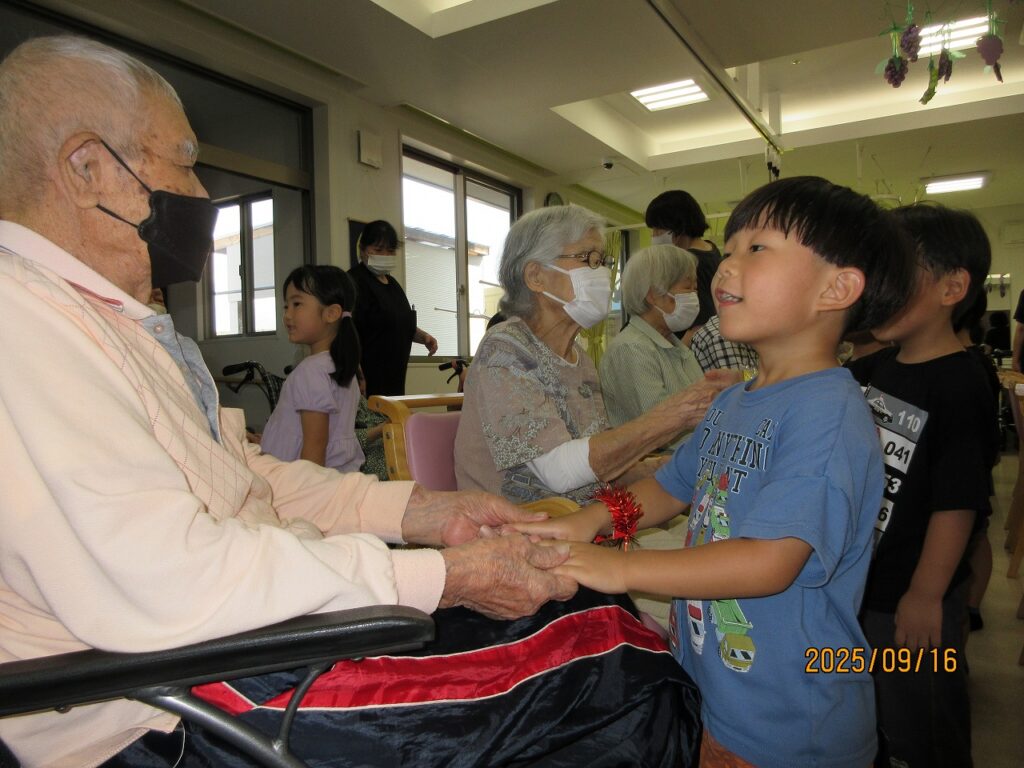 毎年デイサービスセンターふくすけのおじいちゃんおばあちゃんと交流をしていますが、今年は、初めて敬老会に参加しました。