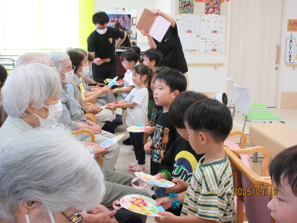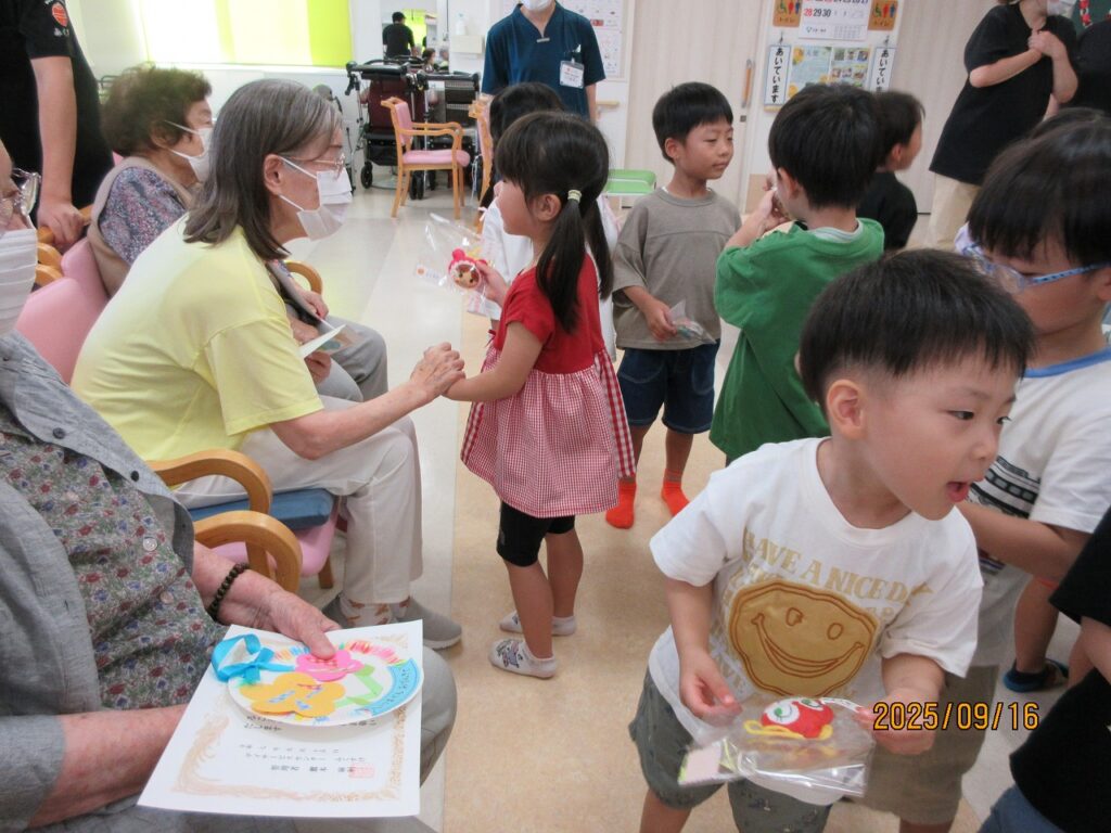 最後に子どもたちが心を込めて作ったプレゼントを渡し、みんなで記念撮影をしました📷職員の皆さんに手作りのお土産をいただくと、早速おばあちゃんたちに見せに行く姿も!玄関を出る時に「おばあちゃんかわいかったー」なんて話す子もいて思わず笑ってしまったのですが、ふくすけのおじいちゃんおばあちゃんの温かいまなざしに、子どもたちも癒されたのだと思います♡
